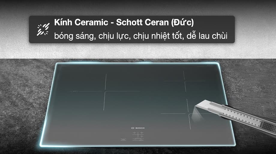 Mặt kính Schott Ceran cao cấp: Sử dụng mặt kính gốm sứ Schott Ceran nhập khẩu từ Đức, có khả năng chịu nhiệt, chịu lực và chống sốc nhiệt tốt (lên đến 750°C). Bề mặt kính cũng rất dễ dàng vệ sinh sau khi sử dụng, chống bám bẩn.