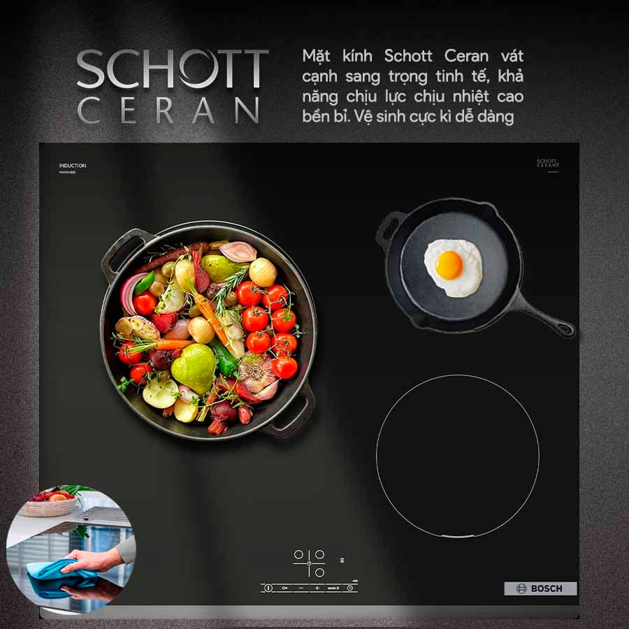 Mặt kính Schott Ceran: Được nhập khẩu từ Đức, có khả năng chịu lực, chịu nhiệt cao (lên đến 750°C), chống trầy xước và dễ dàng vệ sinh.