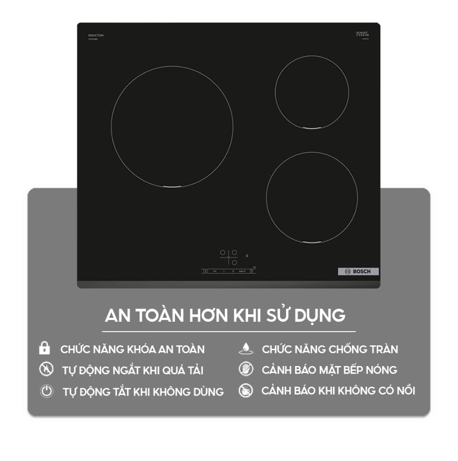 3. Tính năng an toàn trên Bếp từ lắp âm Bosch PUC631BB5E:
