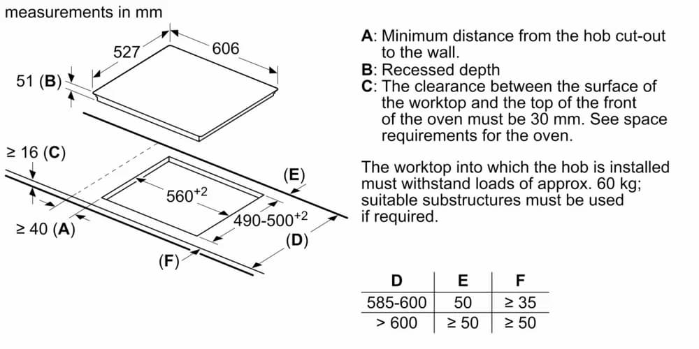 Độ dày mặt bếp tối thiểu: 16 mm.