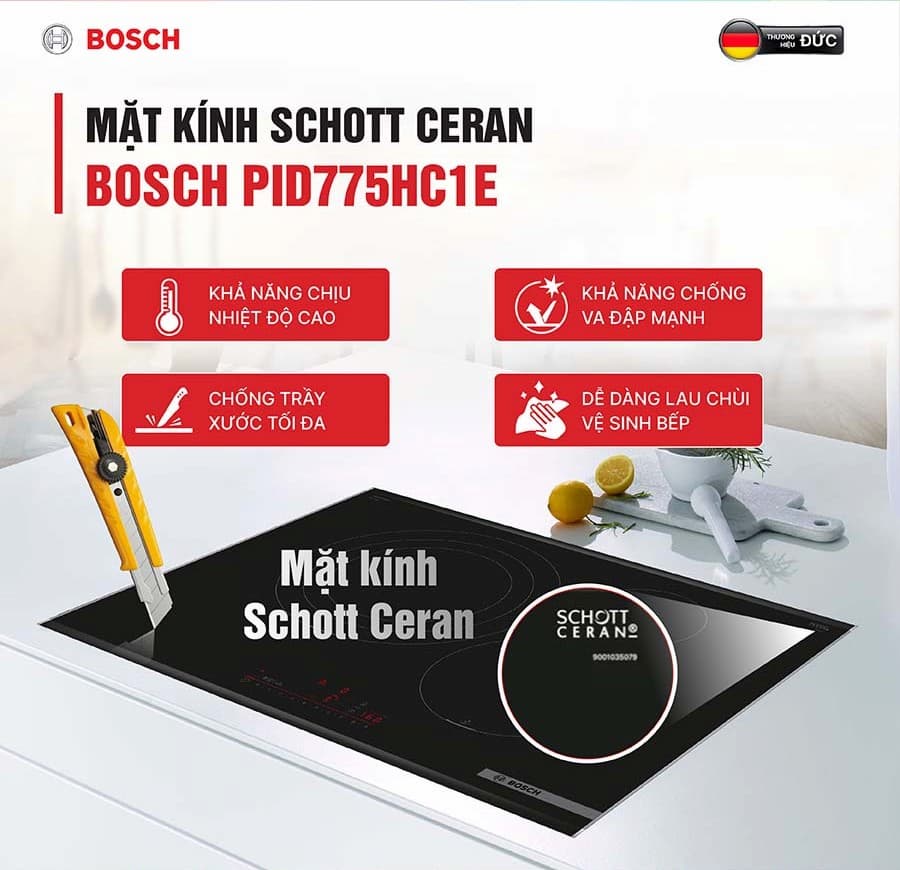 Bếp từ Bosch PID775HC1E thuộc dòng Series 6, được sản xuất tại Tây Ban Nha, nổi bật với thiết kế sang trọng, hiện đại cùng tính năng thông minh Kết nối Home Connect. Bếp là một lựa chọn lý tưởng cho những ai tìm kiếm một chiếc bếp từ cao cấp, tích hợp nhiều công nghệ hiện đại, mang lại trải nghiệm nấu nướng tiện lợi, an toàn và hiệu quả cho căn bếp gia đình. Bếp từ âm Bosch PID775HC1E được trang bị mặt kính gốm thủy tinh Schott Ceran, nổi tiếng về khả năng chịu nhiệt (lên đến 750°C), chịu lực và chống trầy xước tốt.
