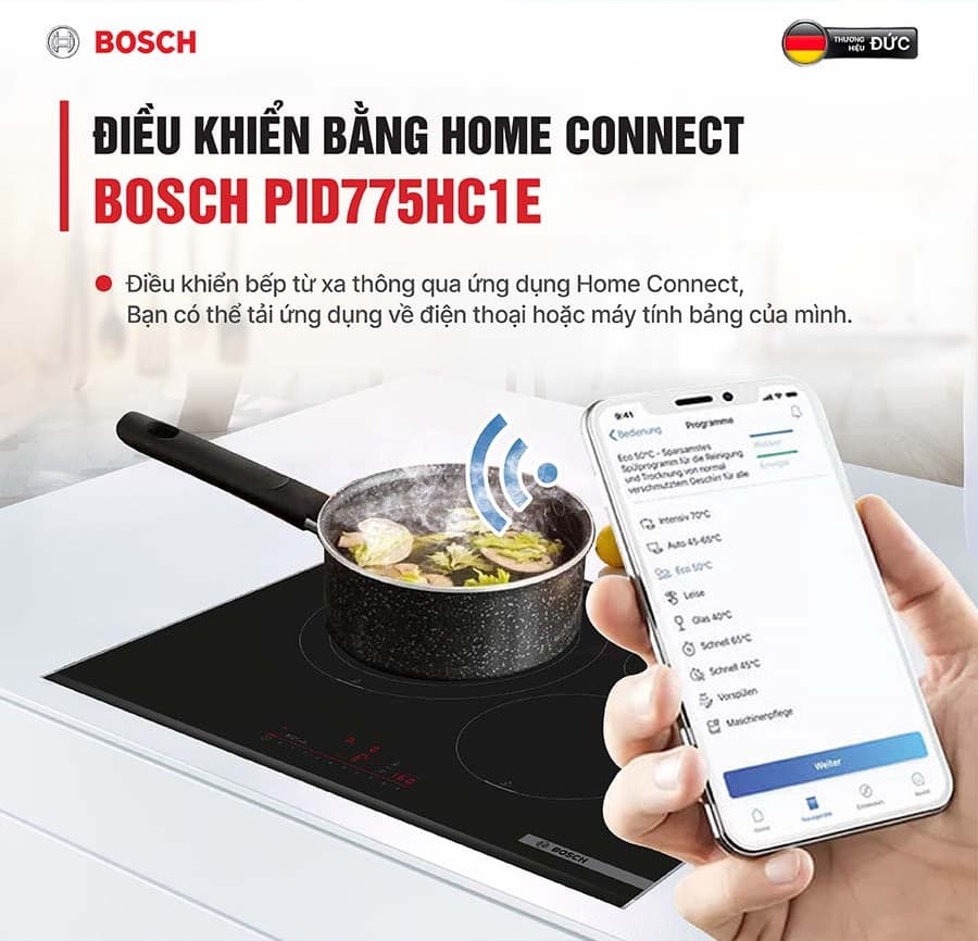 Kết nối Home Connect: Đây là một trong những tính năng nổi bật, cho phép bạn điều khiển bếp từ xa thông qua ứng dụng Home Connect trên điện thoại thông minh. Bạn có thể bật/tắt bếp, điều chỉnh nhiệt độ, cài đặt hẹn giờ và theo dõi quá trình nấu nướng ngay cả khi không có mặt trong bếp. Bếp còn có khả năng điều khiển máy hút mùi tương thích một cách tự động.