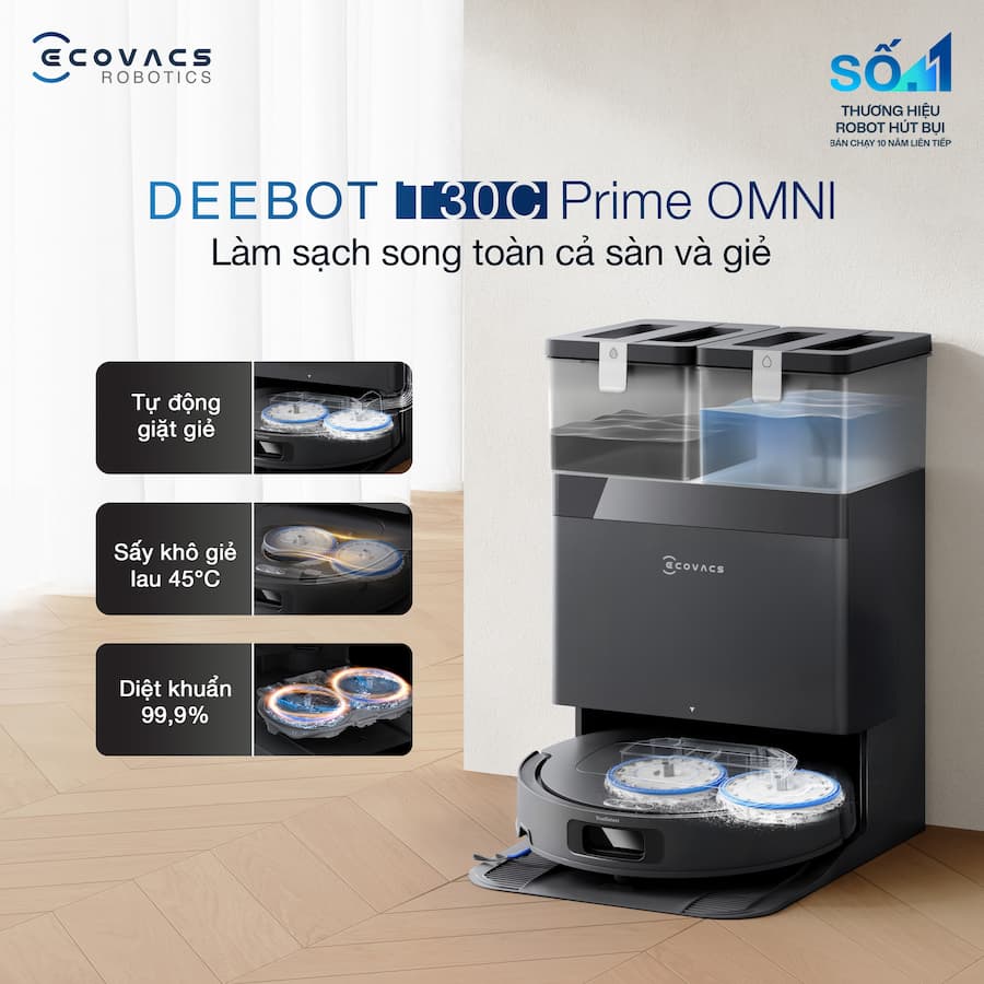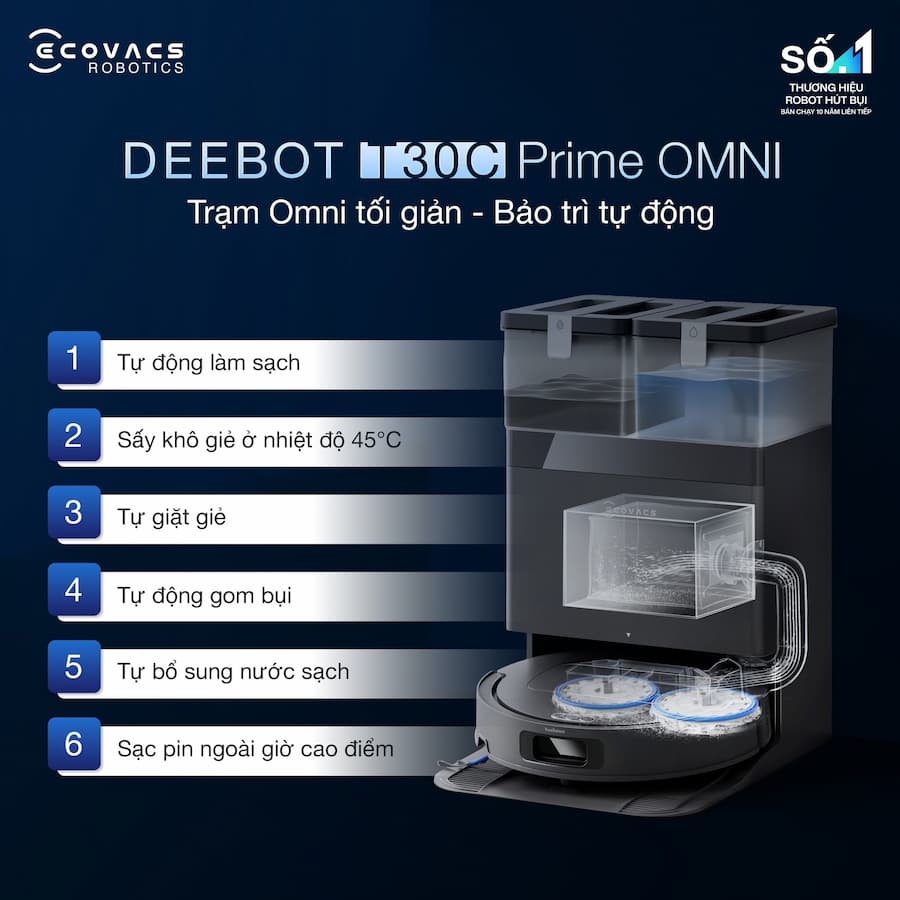 Tổng kết: Ecovacs Deebot T30C Prime Omni là sự lựa chọn hàng đầu nếu bạn đang tìm kiếm một robot có lực hút mạnh nhất, chống rối tóc tốt nhất và khả năng giặt giẻ nước nóng sạch sâu nhất hiện nay.