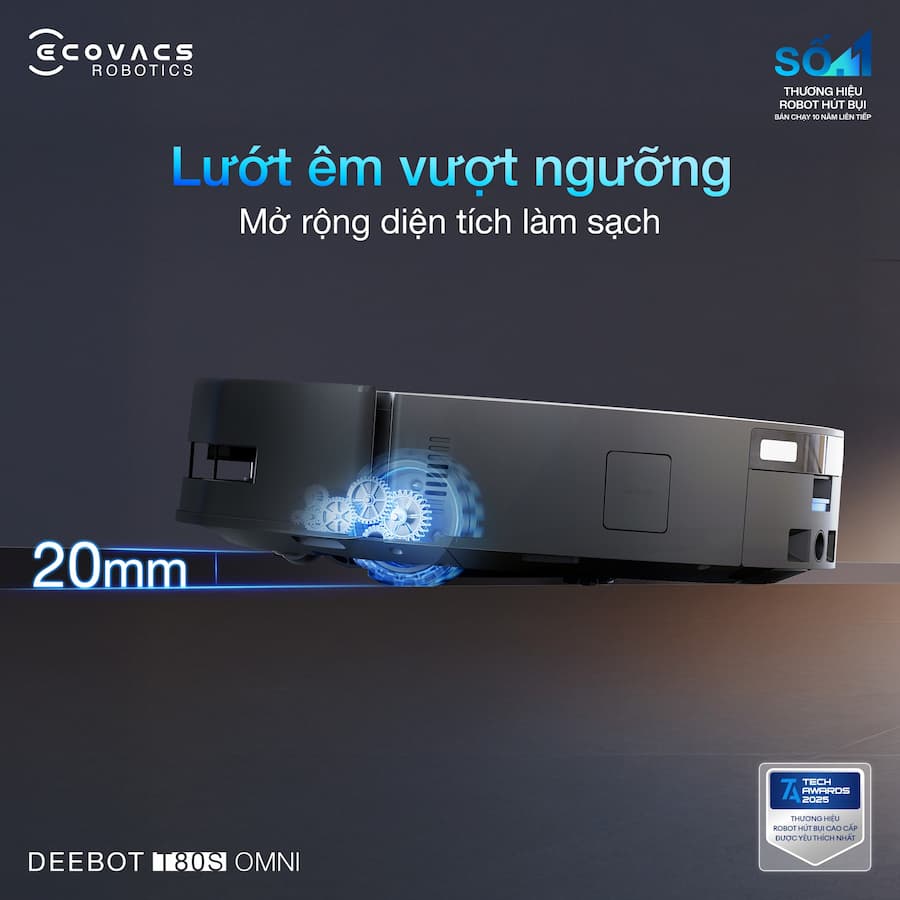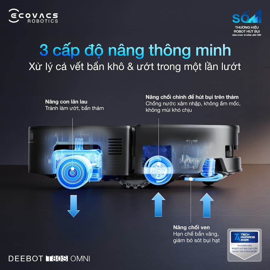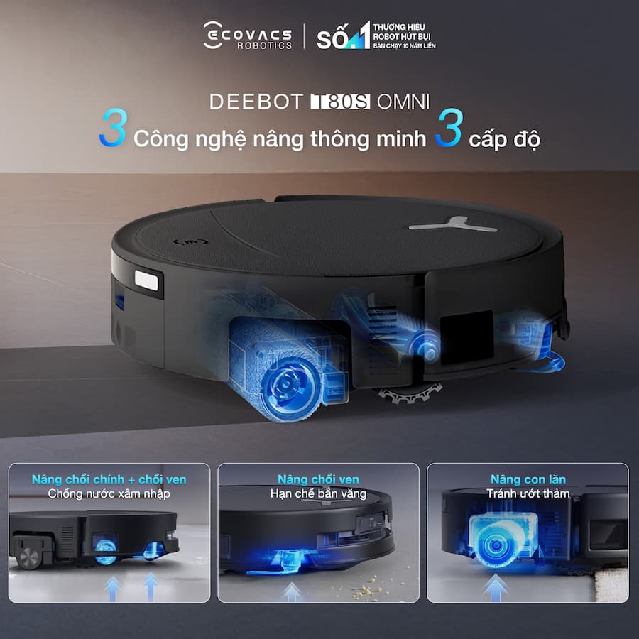 Sự khác biệt giữa một robot thông thường và một "Siêu phẩm" nằm ở khả năng thích ứng. 👉 Ecovacs T80S Omni với hệ thống Triple-Lift nâng ba tầng giúp tối ưu hóa hiệu suất làm sạch trên mọi bề mặt. → Nâng Chổi Chính & Chổi Ven: Tự động nhấc lên khi chỉ lau nhà, ngăn chặn nước xâm nhập vào hệ thống hút, bảo vệ linh kiện tối đa. → Nâng Chổi Cạnh: Điều chỉnh linh hoạt để rác được lùa gọn gàng, loại bỏ tình trạng văng rác, sót bụi → Nâng Con Lăn: Nhận diện thảm bằng siêu âm, nâng con lăn ngay lập tức để giữ thảm luôn khô ráo và sạch sẽ. ✨ T80S Omni nâng niu mọi bề mặt sàn.