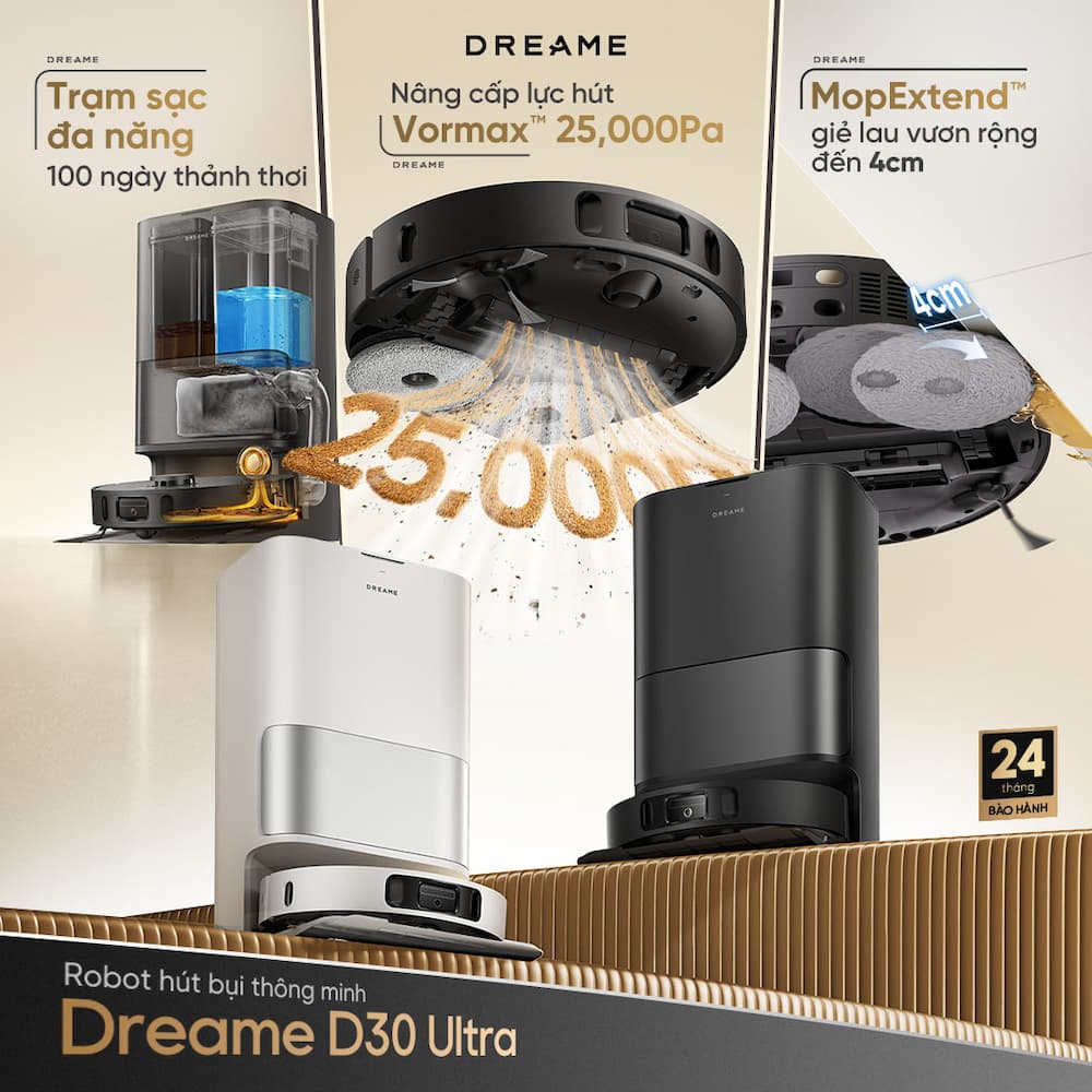 Sao phải đắn đo chọn 1 trong 3 khi Dreame D30 Ultra có tất cả? Là phiên bản mới nhất của dòng D-series siêu hot, robot hút bụi lau nhà Dreame D30 Ultra sở hữu bộ trọn bộ các tính năng cận cao cấp với mức giá mềm mại: Lực hút Vormax™ 25,000Pa xử lý nhóm bụi bẩn siêu nhỏ hiệu quả hơn; Công nghệ MopExtend™ mở rộng giẻ lau 4cm làm sạch sát cạnh. Trạm sạc đa năng: tích hợp quy trình giặt - sấy nóng giẻ 50°C - đổ bụi hoàn toàn khép kín. D30 Ultra đặc biệt phù hợp cho những gia đình có diện tích sàn lớn (>100m2), nhà có trẻ nhỏ cần sàn sạch khuẩn, hoặc những người bận rộn muốn dành thời gian nghỉ ngơi thay vì dọn dẹp. Nếu bạn đang tìm kiếm một "trợ lý" dọn dẹp thực thụ chứ không chỉ là một chiếc máy hút bụi đơn thuần, Dreame D30 Ultra là một khoản đầu tư xứng đáng.