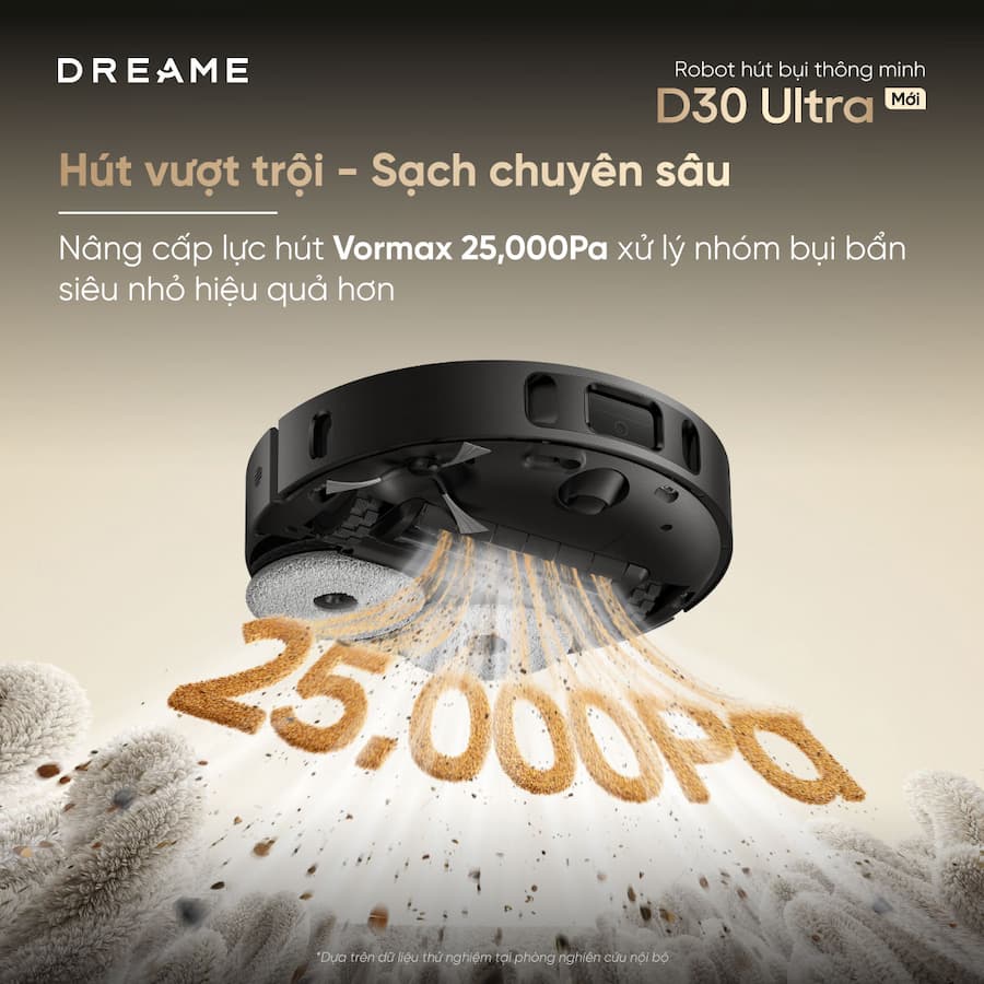 Đây là điểm ấn tượng nhất của D30 Ultra. Với lực hút lên đến 25.000Pa (cao gấp 3-4 lần so với các dòng robot cao cấp thông thường), máy có thể hút sạch mọi thứ từ bụi mịn trong kẽ sàn đến các mảnh vụn lớn như cát mèo, hạt thức ăn hay lông thú cưng bám sâu trên thảm.