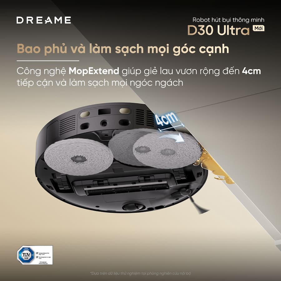 Với công nghệ MopExtend™ RoboSwing, D30 Ultra tự "thò" giẻ lau ra ngoài để làm sạch sát mép tường và chân ghế. Bạn sẽ không còn phải cầm chổi đi quét lại các góc sau khi robot đã chạy xong.