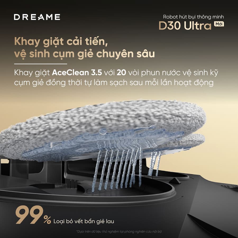 Thay vì chỉ kéo lê tấm giẻ, D30 Ultra sử dụng hai giẻ lau xoay với tốc độ cao và áp lực ấn xuống sàn đạt 6N. Điều này giúp robot đánh bay các vết bẩn cứng đầu (như vết cà phê khô, vết bùn đất) hiệu quả hơn nhiều so với công nghệ lau rung thông thường.