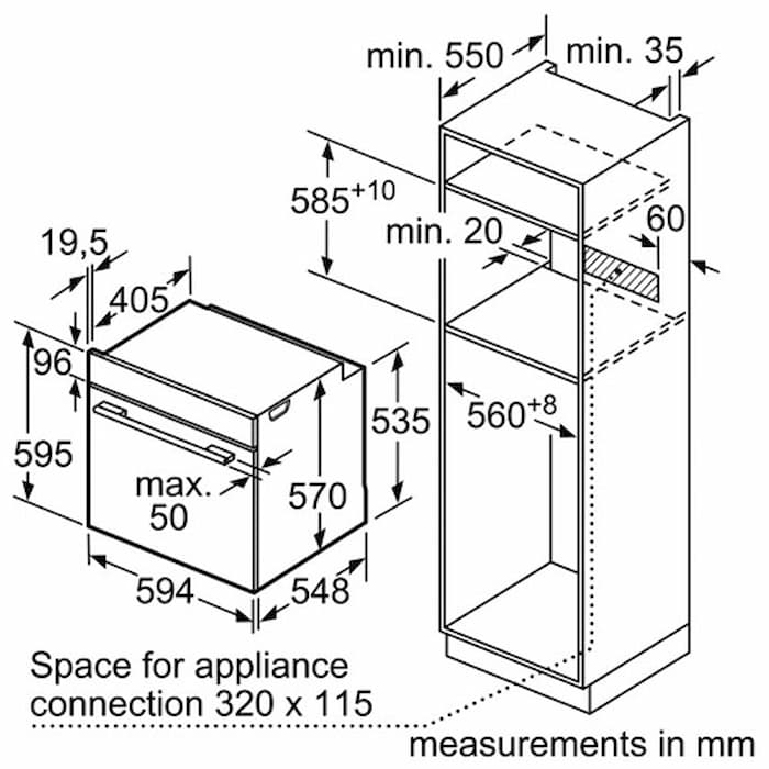 Kích thước lắp đặt (C x R x S): 585-595 x 560-568 x 550 mm