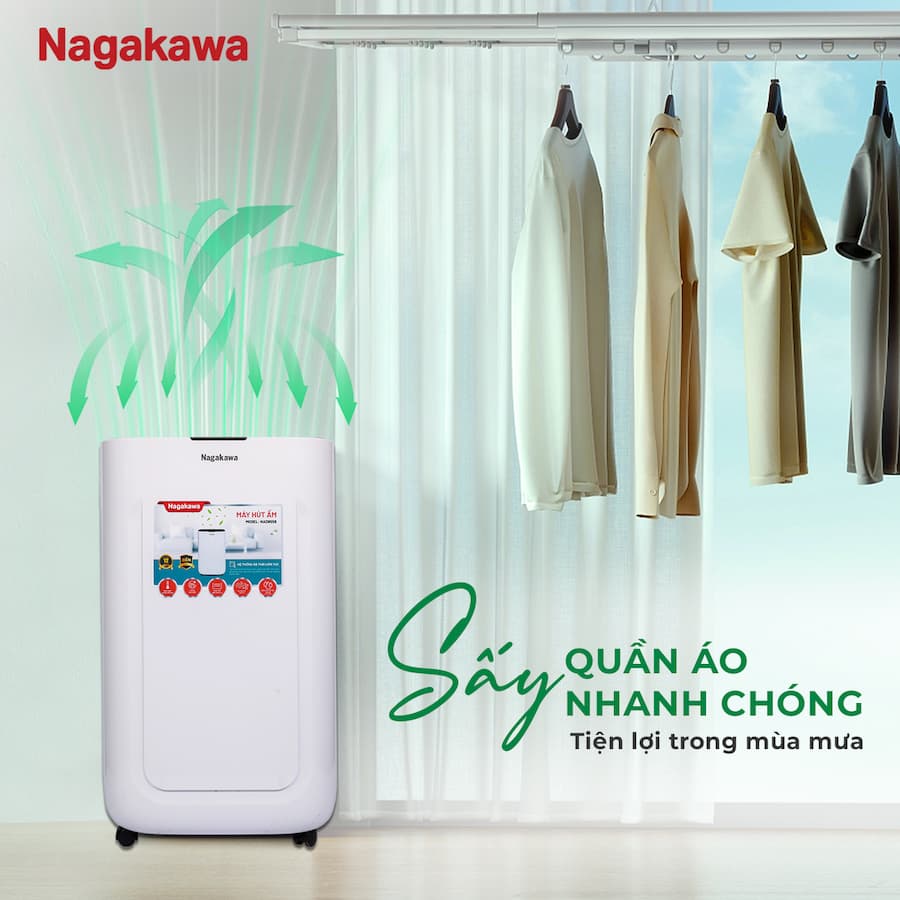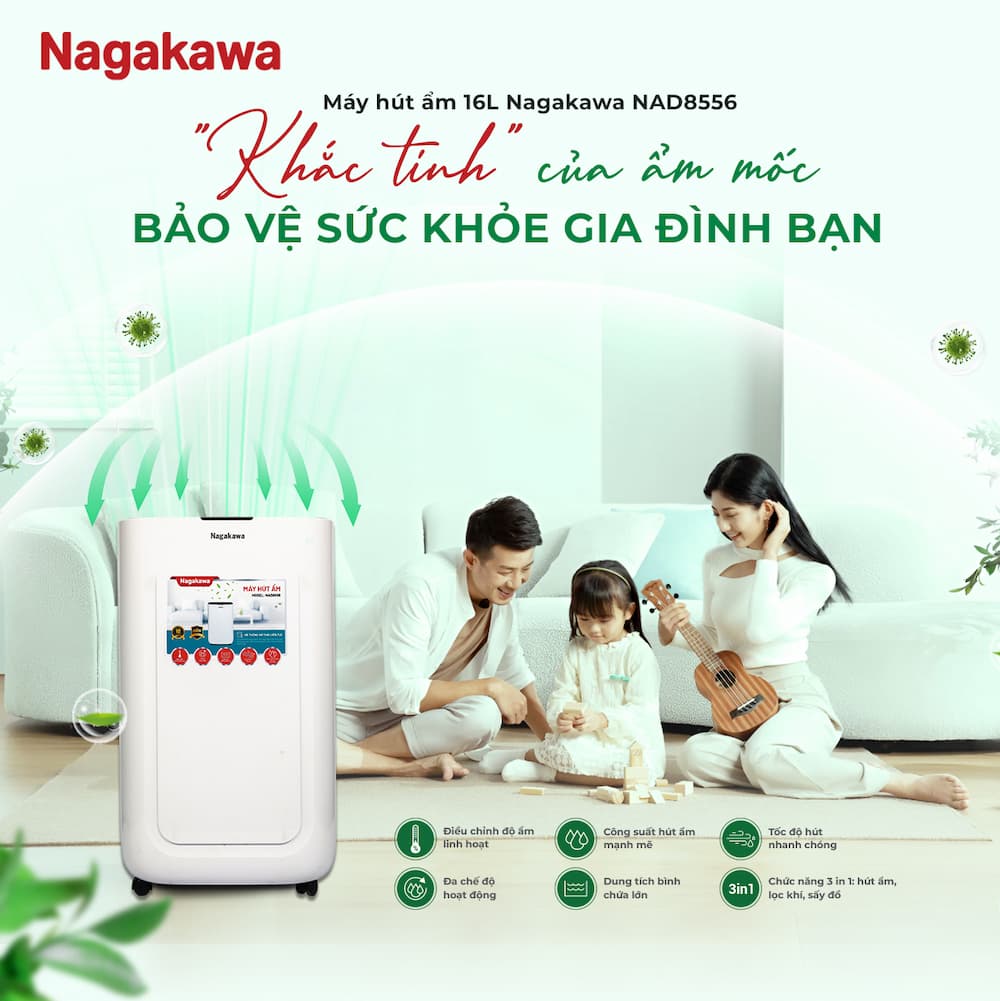 "KHÔNG KHÍ TRONG LÀNH - ẨM MỐC BAY XA" CÙNG MÁY HÚT ẨM 16L NAGAKAWA NAD8556! 🌧️ Mùa nồm ẩm đang đến gần, bạn lo lắng về tình trạng ẩm ướt, nấm mốc, mùi hôi khó chịu trong nhà? Hay đơn giản bạn muốn một bầu không khí trong lành hơn cho gia đình? Đừng lo, Nagakawa NAD8556 chính là giải pháp hoàn hảo dành cho bạn! NAD8556 được trang bị các công nghệ và tính năng hiện đại, giúp kiểm soát độ ẩm hiệu quả và mang lại nhiều tiện ích. Đừng để nồm ẩm làm ảnh hưởng đến cuộc sống của bạn! Hãy sở hữu ngay Máy hút ẩm Nagakawa NAD8556 để tận hưởng bầu không khí trong lành, khô ráo và bảo vệ sức khỏe cho cả gia đình!