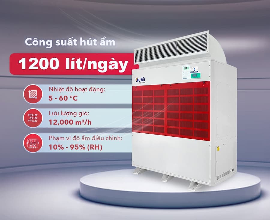 Lưu lượng gió lớn: Với lưu lượng gió 12.000 m³/h, máy đảm bảo luân chuyển không khí hiệu quả, giúp quá trình hút ẩm diễn ra nhanh chóng