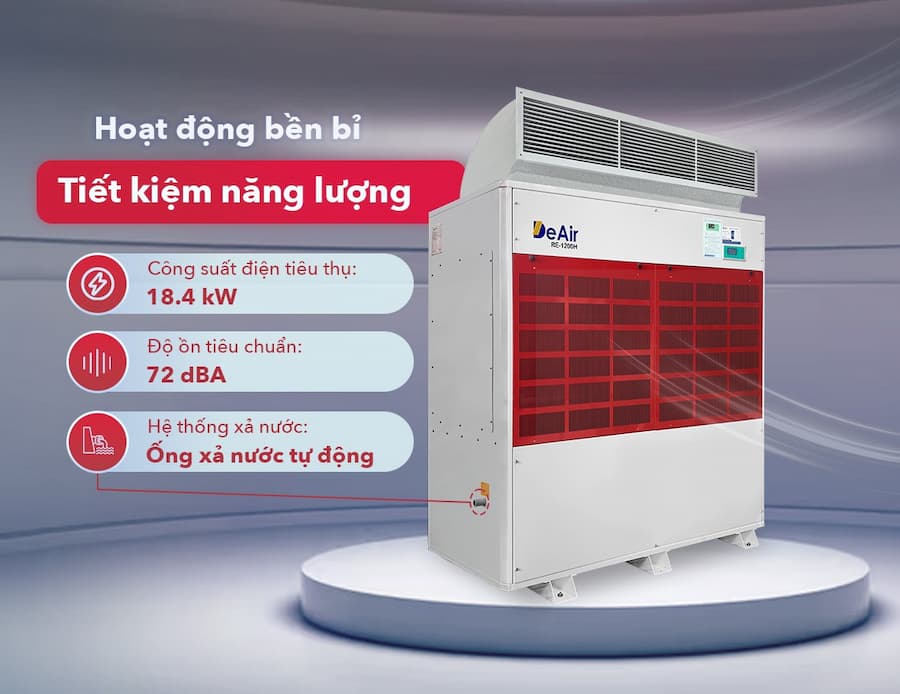 Nhìn chung, máy hút ẩm chịu nhiệt DeAir RE-1200H là giải pháp lý tưởng cho các doanh nghiệp cần một thiết bị có công suất lớn, hoạt động bền bỉ trong môi trường khắc nghiệt, giúp tối ưu hóa quy trình sản xuất và bảo quản, từ đó nâng cao năng suất và chất lượng sản phẩm.