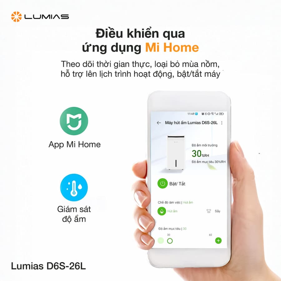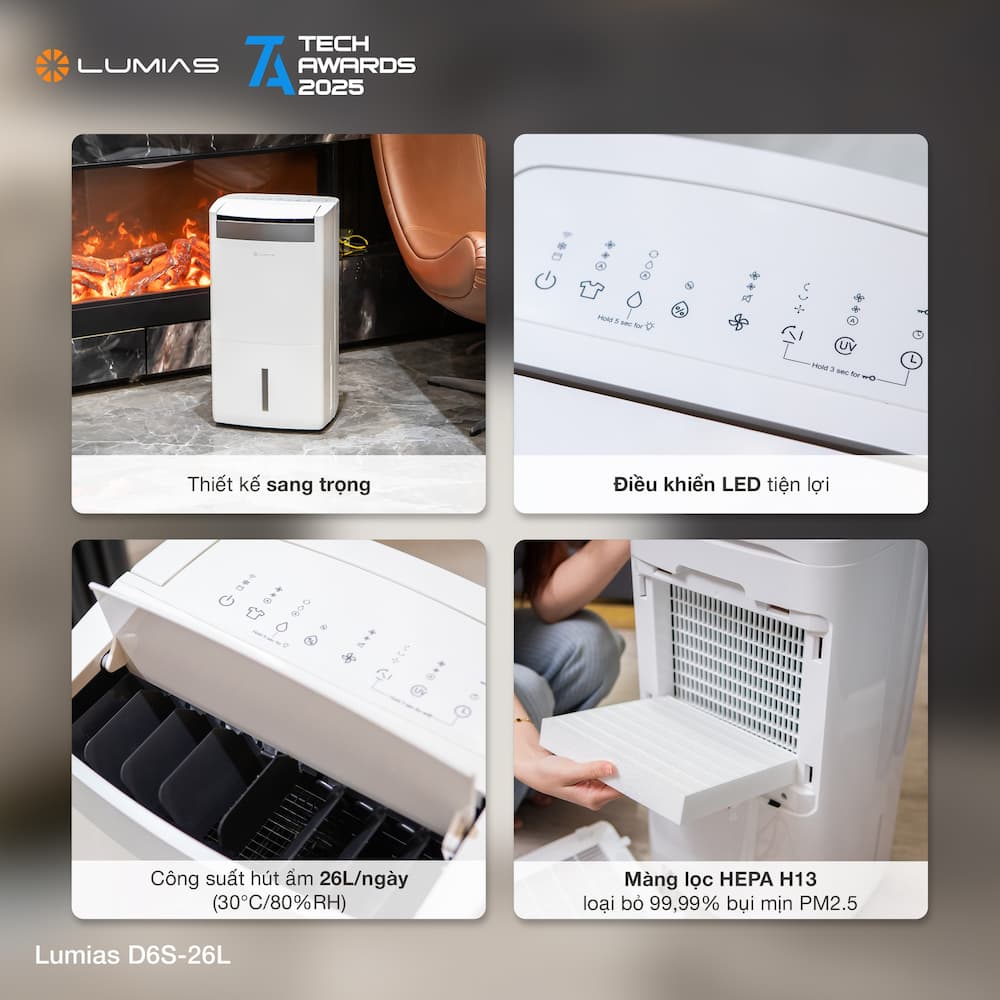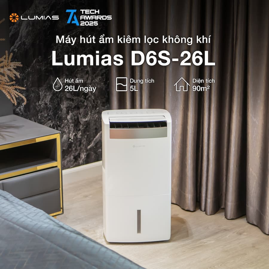 Độ ẩm cao, khí bí bách, nấm mốc phát triển? 👉 Máy hút ẩm kiêm lọc không khí Lumias D6S-26L chính là giải pháp toàn diện cho căn hộ, không gian rộng đến 90m². Lumias D6S-26L là một thiết bị đa năng, mang đến giải pháp toàn diện để kiểm soát độ ẩm, bảo vệ đồ đạc và nâng cao chất lượng không khí, rất thích hợp cho gia đình có trẻ nhỏ, người già hoặc người có vấn đề về hô hấp. Sắm Lumias D6S-26L - Giữ nhà luôn khô thoáng, trong lành như ý!
