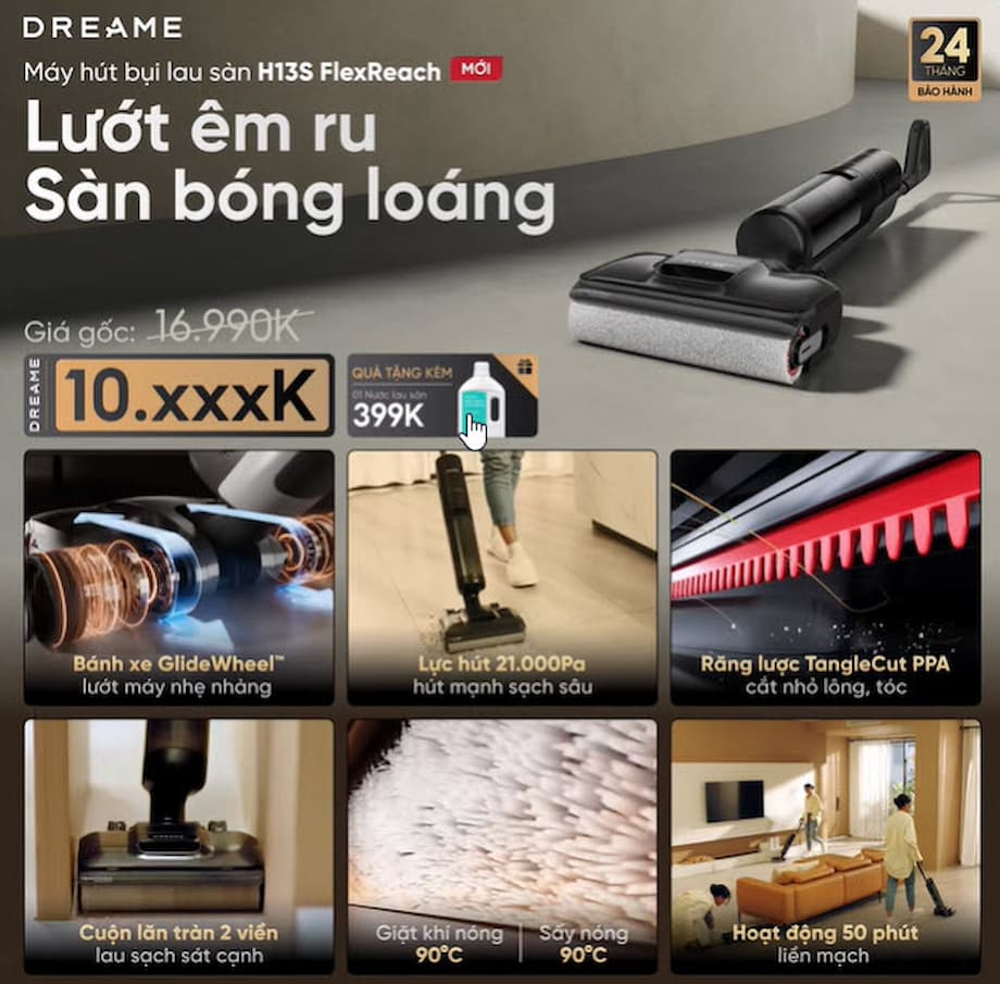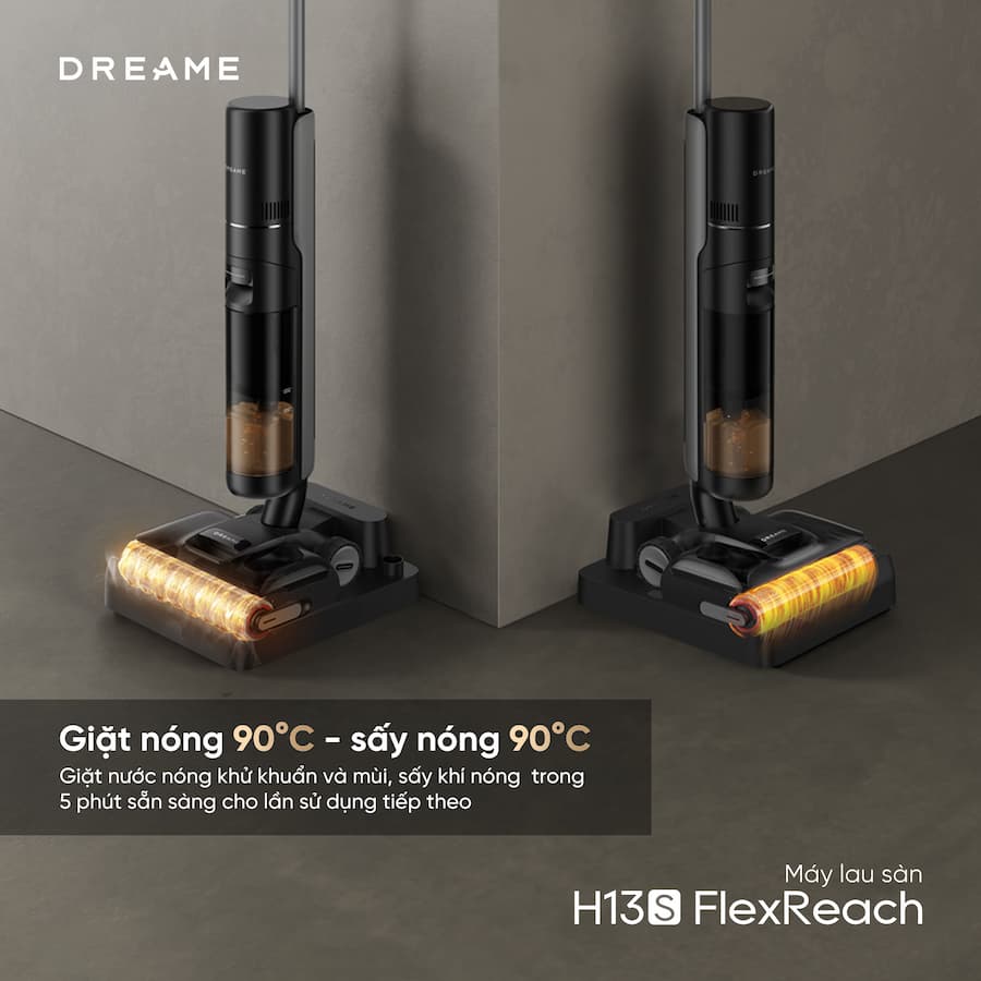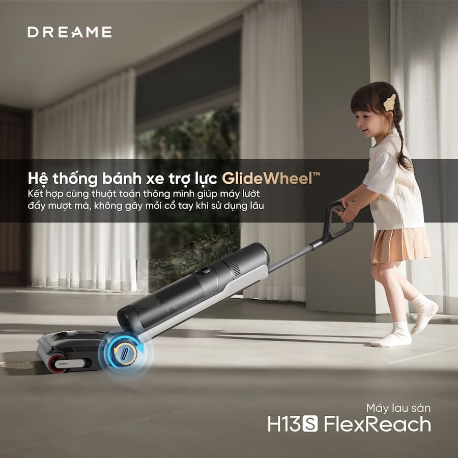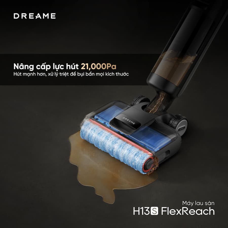 Dreame H13S FlexReach là một bước tiến mới trong dòng máy hút bụi lau sàn (Wet & Dry Vacuum) của Dreame, nổi bật với khả năng ngả phẳng hoàn toàn và hệ thống vệ sinh cuộn lăn bằng nước nóng 90°C. Chọn máy lau sàn để tiết kiệm thời gian, hóa ra gian nan chỉ mới bắt đầu vì… máy quá nặng!!! Tay mỏi, lưng căng, nhàn hơn chỗ nào??? Nhàn hơn ở chỗ, nếu máy lau sàn bạn chọn là H13S FlexReach - phiên bản nâng cấp tinh tế trong dải sản phẩm FlexReach-series: Lướt êm ru: đẩy tới nhẹ nhàng, lùi lại mượt mà với hệ thống bánh xe trợ lực GlideWheel™ tiên tiến >>> không mất sức, không dùng lực. Sàn bóng loáng: lực hút đạt đến 21,000Pa >>> hút mạnh hơn, xử lý triệt để bụi bẩn mọi kích thước. Chính thức ra mắt tại Việt Nam với ưu đãi hấp dẫn - sắm ngay một em Máy hút bụi khô và ướt Dreame H13S FlexReach sẵn sàng cho mùa dọn nhà !