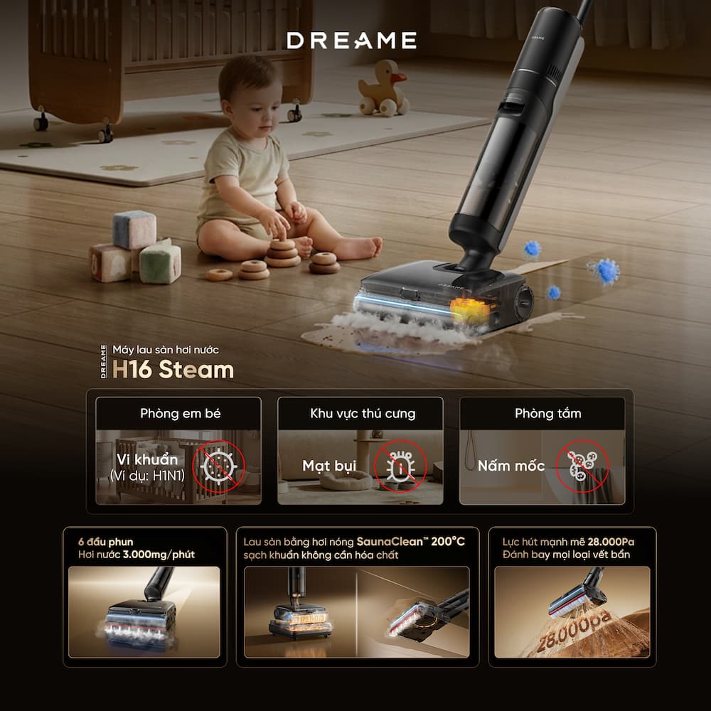 Dreame H16 Steam là giải pháp làm sạch 3 trong 1: Hút bụi, Lau sàn và Khử trùng bằng hơi nước. Đây là phiên bản nâng cấp mạnh mẽ từ dòng H15, tập trung vào khả năng xử lý các vết bẩn cứng đầu và diệt khuẩn chuyên sâu. Khi sàn nhà trở thành không gian vui chơi của trẻ, sự sạch sẽ không nên chỉ được nhìn bằng mắt, hãy để những con số của H16 Steam mang lại cảm giác an tâm cho mẹ: Làm sạch bằng hơi nóng SaunaClean™ 200°C - hỗ trợ loại bỏ vi khuẩn mà không cần dùng hóa chất. 6 đầu phun hoạt động cùng lúc với lưu lượng 3.000mg/phút - phân bổ hơi nước đều, tăng hiệu quả làm sạch. Lực hút 28.000Pa - xử lý triệt để cả vết bẩn khô lẫn ướt trong một lần đẩy máy. Không cần thêm bước. Không cần thêm hóa chất. Để sàn nhà luôn là nơi bé có thể thoải mái vui chơi mỗi ngày, tham khảo ngay Máy hút bụi lau nhà cầm tay Dreame H16 Steam.