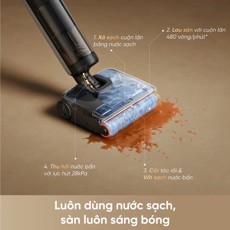 Sức mạnh làm sạch tuyệt đối (Lực hút 28.000 Pa): Đây là con số ấn tượng nhất, giúp máy không chỉ hút được bụi mịn mà còn xử lý tốt các loại rác nặng, chất lỏng đặc và mảnh vụn lớn trên sàn nhà một cách dễ dàng.