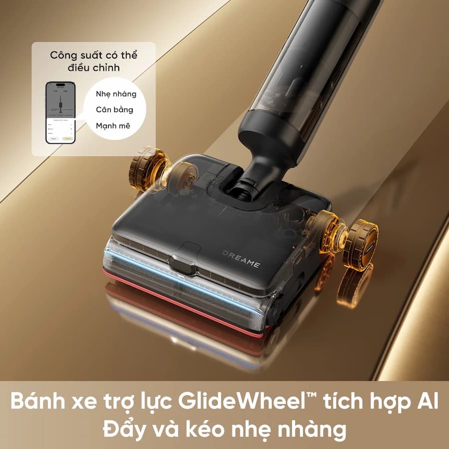 Hệ thống trợ lực GlideWheel™ kéo đẩy nhẹ nhàng: Thuật toán thông minh điều khiển hai bánh sau, hỗ trợ đẩy – kéo nhẹ nhàng, biến việc lau sàn từ một công việc nặng nhọc thành trải nghiệm thoải mái sau giờ làm.