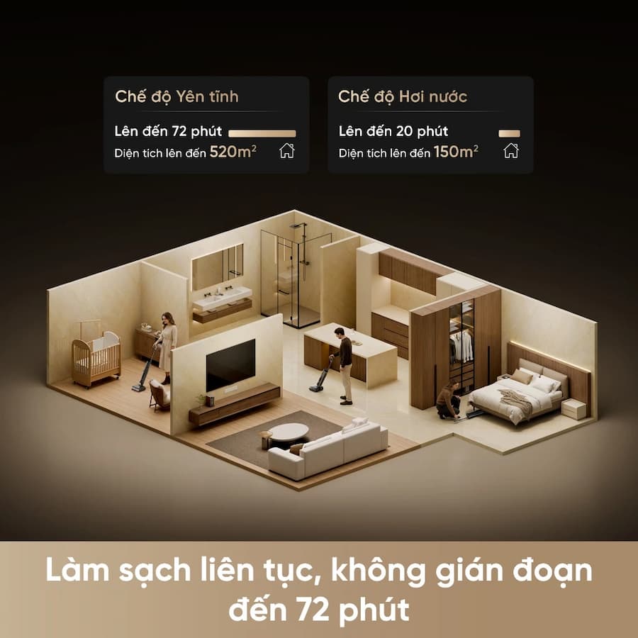 Thời gian hoạt động: * Lên đến 72 phút (Chế độ im lặng/hút bụi khô).