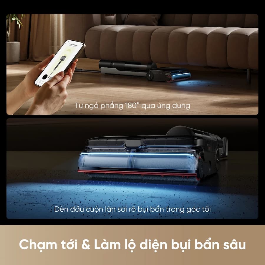Thiết kế Ngả phẳng 180° linh hoạt: Máy có thể nằm phẳng hoàn toàn xuống mặt sàn để luồn sâu vào gầm giường, gầm tủ mà không bị hở đầu hút hay trào nước, giúp làm sạch toàn diện mọi ngóc ngách trong nhà.