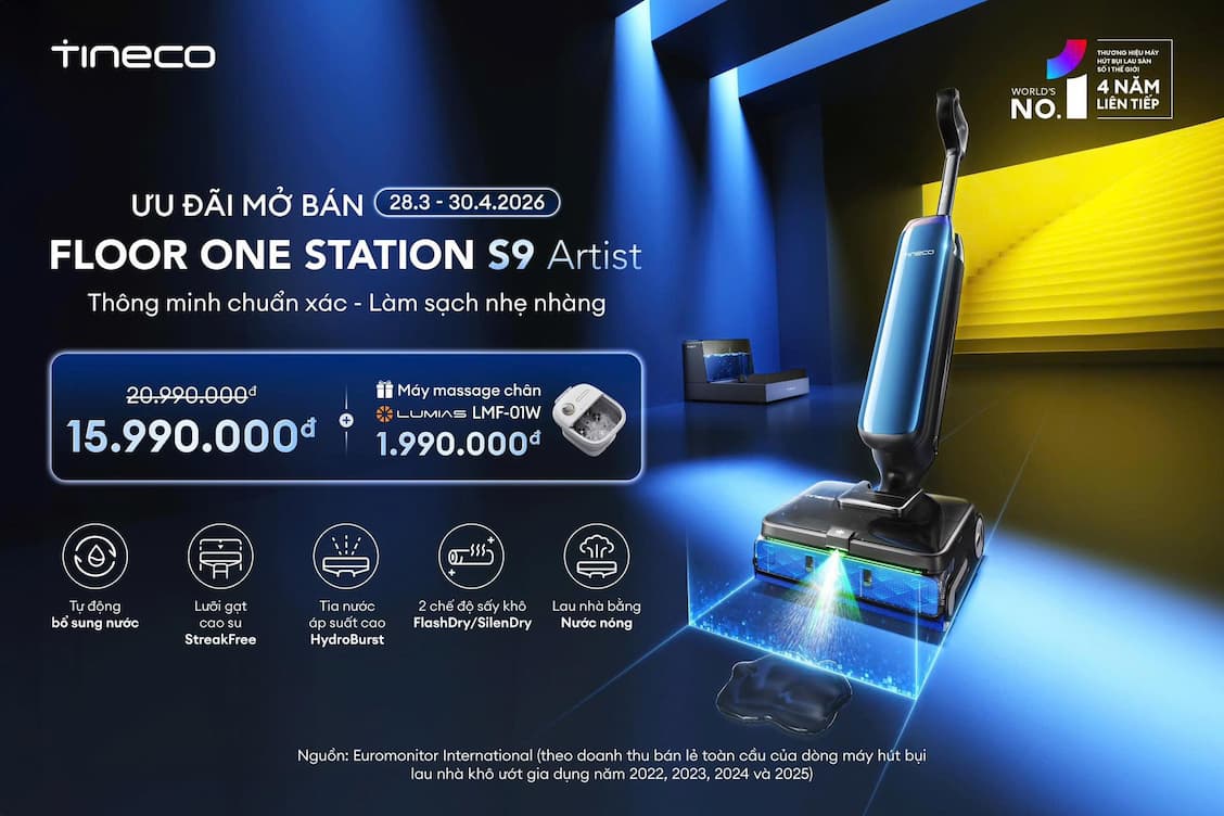 Tineco FLOOR ONE STATION S9 Artist là dòng máy hút bụi lau sàn cao cấp mới nhất của Tineco, tập trung vào việc cải thiện khả năng tiếp cận các khu vực khó nhằn và tối ưu hóa hệ thống tự làm sạch. Vết dầu mỡ hay vi khuẩn ẩn nấp không còn là nỗi lo! Tineco Station S9 Artist xử gọn tất cả chỉ trong một lượt nhờ công nghệ lau sàn bằng nước nóng: Nhiệt độ cao hòa tan mọi vết bẩn cứng đầu, trả lại mặt sàn sạch bong. Loại bỏ vi khuẩn nhanh chóng, giữ tổ ấm luôn trong lành. Tự bổ sung nước nóng tại đế sạc, duy trì hiệu quả làm sạch đến 7 ngày. Máy hút bụi lau sàn khô ướt Tineco STATION S9 Artist là lựa chọn hàng đầu nếu bạn cần một chiếc máy có lực hút mạnh nhất hiện nay, khả năng chui gầm tốt và hệ thống sấy khô con lăn nhanh chóng để tránh mùi hôi. Một lần lướt, sàn sạch tinh tươm với Tineco Station S9 Artist!