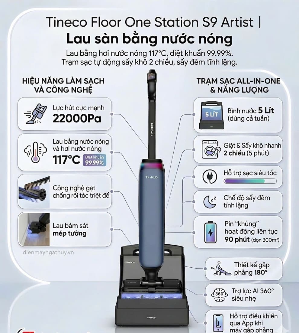 Tineco FLOOR ONE S9 Artist không chỉ là một chiếc máy hút bụi lau sàn thông thường mà còn là một bước tiến về thiết kế công thái học và công nghệ vệ sinh thông minh. Máy hút bụi lau sàn khô ướt Tineco FLOOR ONE STATION S9 Artist là một thiết bị đột phá trong lĩnh vực dọn dẹp, kết hợp giữa hiệu suất làm sạch mạnh mẽ và các công nghệ tiên tiến, mang đến trải nghiệm làm sạch tối ưu. Máy sở hữu lực hút mạnh mẽ 22.000Pa kết hợp với công nghệ HydroBurst phun tia nước áp suất cao, giúp xử lý mọi vết bẩn cứng đầu. Dưới đây là các tính năng nổi bật mới nhất: