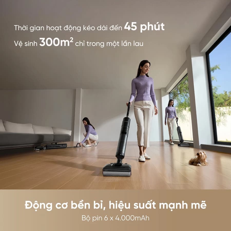 Hút bụi và lau sàn ướt/khô đồng thời: Máy có thể xử lý cả bụi khô, mảnh vụn và các vết bẩn ướt cùng lúc, giúp tiết kiệm thời gian và công sức dọn dẹp.