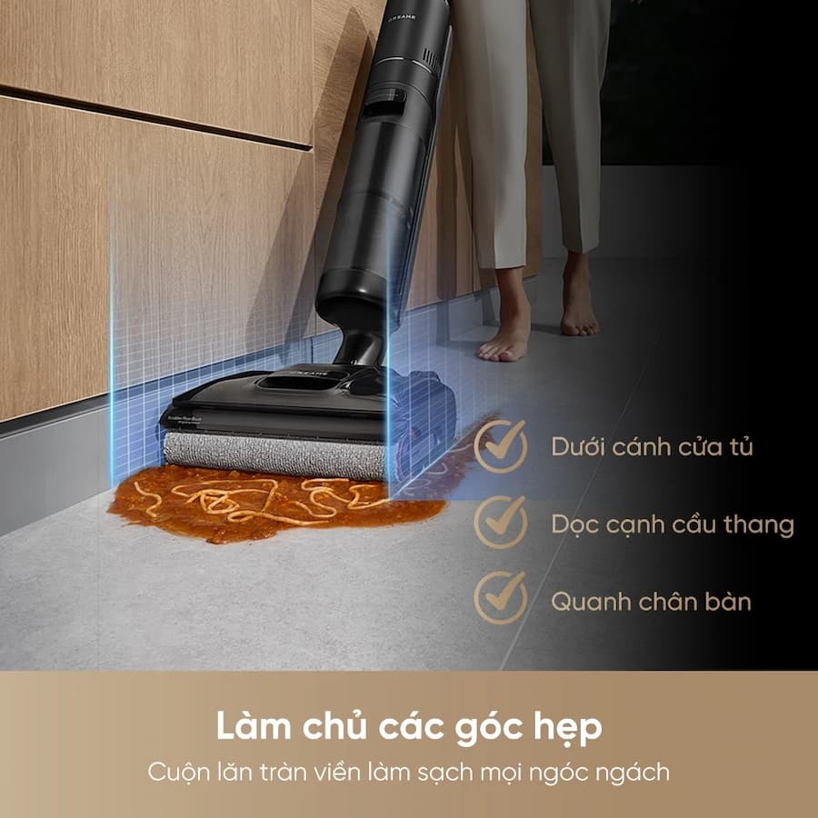 Cuộn lăn tràn viền: Thiết kế cuộn lăn sát cạnh giúp làm sạch hiệu quả các khu vực dọc theo chân tường, góc phòng và chân đồ nội thất, không bỏ sót vết bẩn nào.