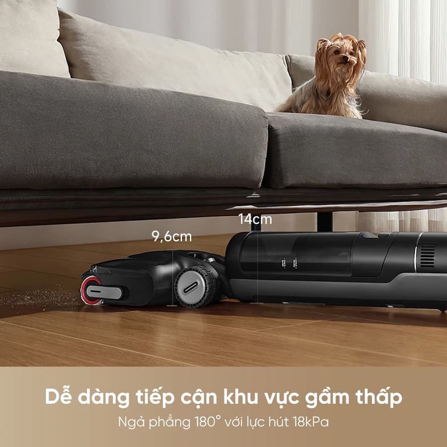 Khả năng ngả phẳng 180° linh hoạt (FlexReach): Đây là điểm nhấn chính của sản phẩm, cho phép máy dễ dàng luồn lách vào các không gian thấp như gầm giường, gầm tủ, gầm ghế, giúp làm sạch sâu những vị trí khó tiếp cận mà các máy lau sàn thông thường khó làm được.