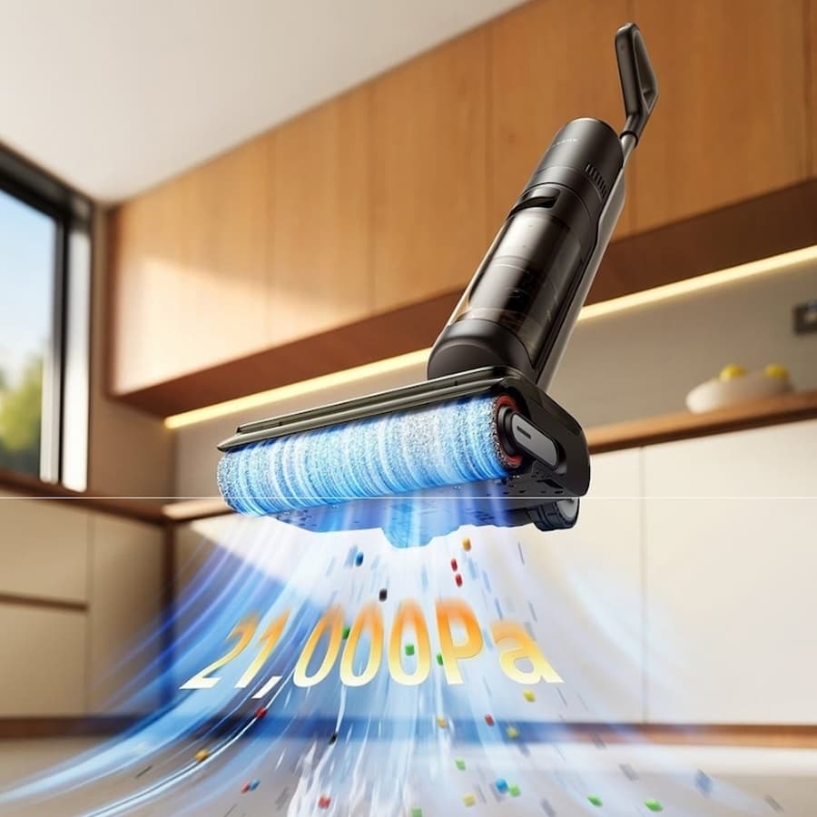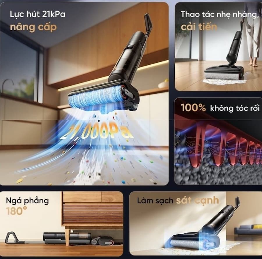 Lau sát mép (Edge-to-Edge): Thiết kế cuộn lăn tràn viền giúp máy tiếp cận sát vách tường chỉ khoảng vài milimet. Bạn không còn phải cầm khăn lau tay lại những góc khuất mà máy không tới được.