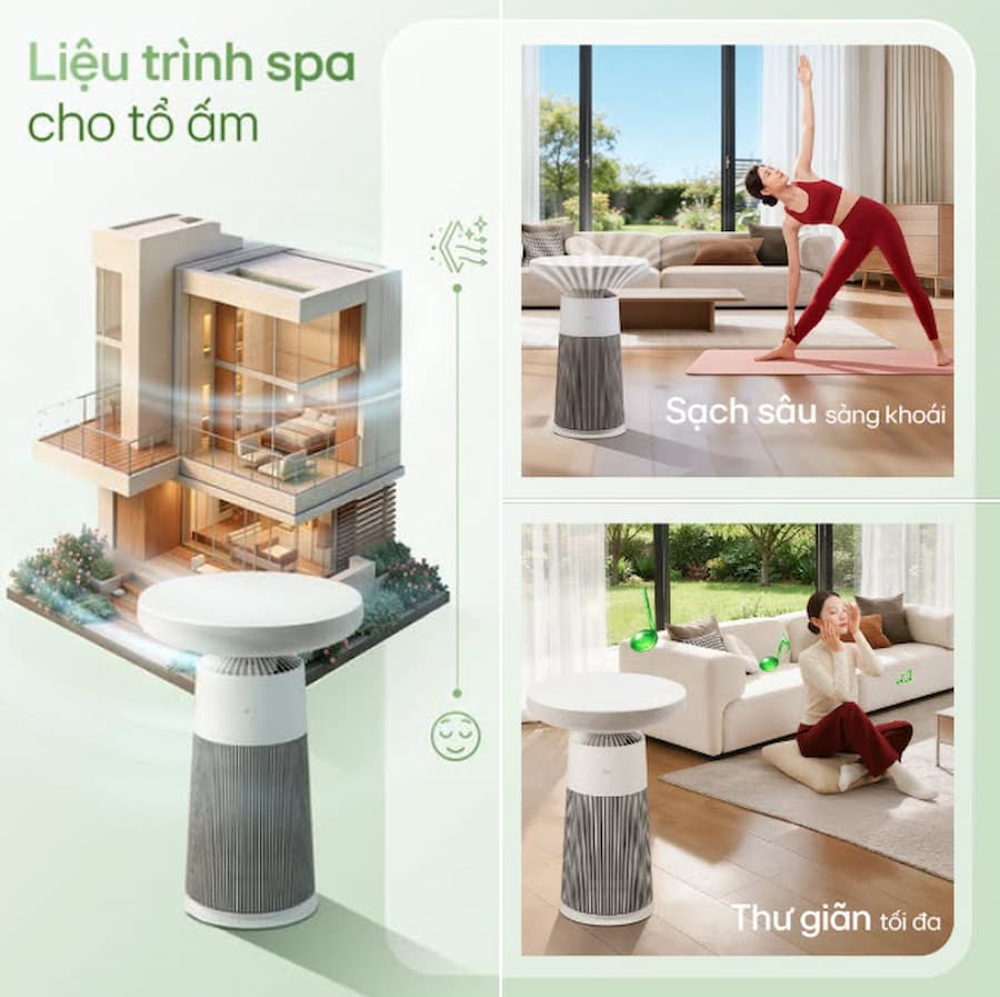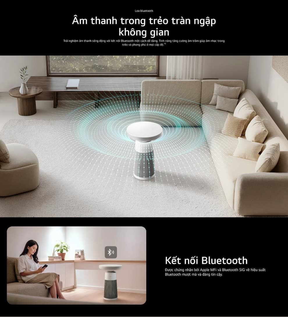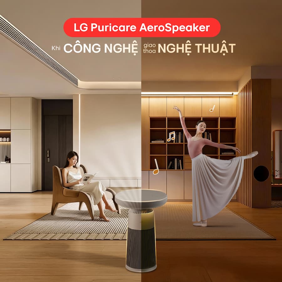 Không chỉ thở thật chill, các giác quan của bạn đều sẽ được chiều với máy lọc không khí kèm loa LG Puricare AeroSpeaker: Khứu giác: Hít thở trong không khí trong lành nhờ bộ lọc HEPA 360° loại bỏ 99.9% vi khuẩn trong không khí và bụi siêu mịn nhỏ đến 0.01 micromet. Thị giác: Thiết kế bàn nhỏ tinh tế tích hợp đèn đổi màu theo tâm trạng, làm điểm nhấn tinh tế cho không gian. Thính giác: Công nghệ âm thanh 360° mang đến trải nghiệm sống động, tự nhiên và chất lượng cao. Chill mọi giác quan, đó chính là giai điệu phát ra từ LG PuriCare™ AeroSpeaker AS20GSHU0 – chiếc máy lọc không khí tích hợp loa phát nhạc vừa ra mắt! Máy lọc không khí kèm loa LG PuriCare Aero Speaker là một thiết bị "lai" độc đáo, xóa nhòa ranh giới giữa đồ gia dụng và nội thất cao cấp.
