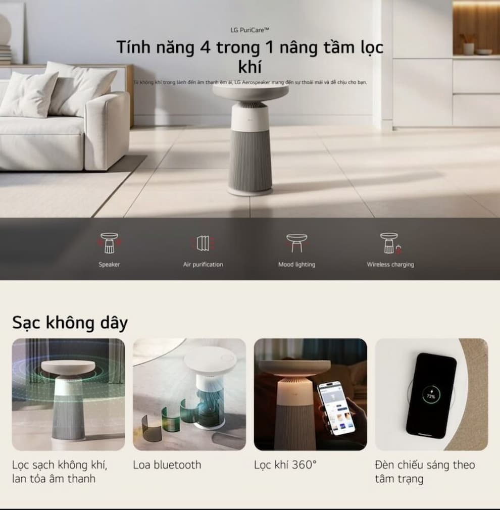 Máy lọc không khí kèm Loa LG PuriCare Aero Speaker AS20GSHU0.ABAE có thiết kế 4 trong 1, tích hợp máy lọc không khí, loa Bluetooth, đèn chiếu sáng và sạc không dây. Về hiệu suất, máy sử dụng bộ lọc PuriCare (HEPA/VDT) và công nghệ UVnano để làm sạch không khí toàn diện, loại bỏ bụi mịn và vi khuẩn. LG AS20GSHU0.ABAE còn có khả năng kết nối thông minh qua ứng dụng LG ThinQ, cho phép điều khiển từ xa một cách tiện lợi. Trải nghiệm nghệ thuật trong không gian sống bên ánh đèn dịu có thể tùy chỉnh theo tâm trạng, cùng loa 360° tích hợp, biến căn phòng thành một không gian thư giãn đầy cảm hứng. Dưới đây là những điểm nổi bật khiến sản phẩm này trở nên khác biệt: