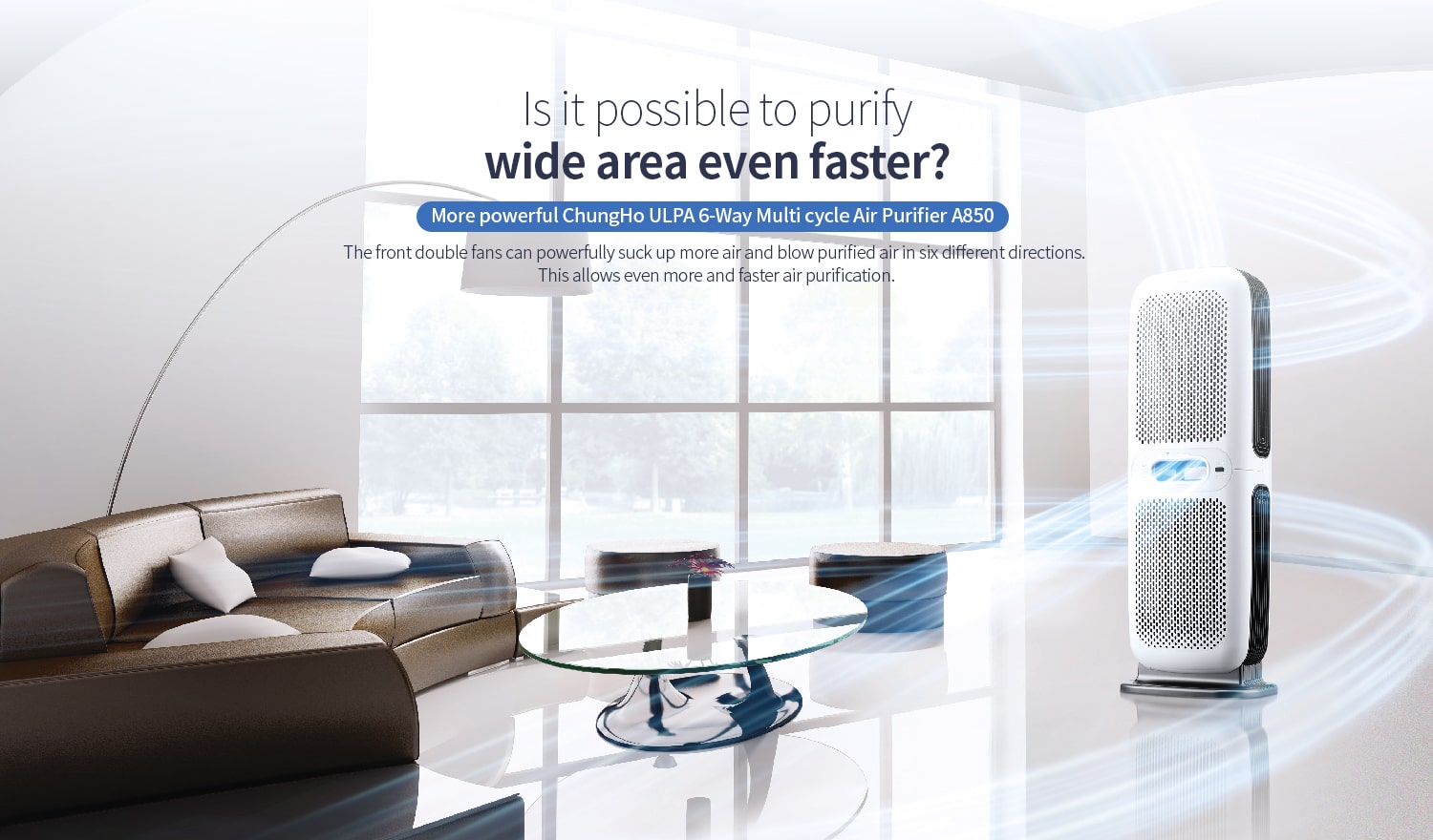 Máy lọc không khí Chungho 6-WAY ULPA A850 ra đời là một sự đột phá công nghệ, thay đổi thói quen sử dụng máy lọc không khí thông thường với lõi lọc cũ, thô sơ, thiếu an toàn sang những chiếc máy lọc thế hệ mới cao cấp, tiện nghi và an toàn hơn với người sử dụng. Chungho 6-WAY ULPA A850 là máy lọc không khí sử dụng màng lọc Ulpa-màng lọc tiên tiến nhất hiện nay giúp loại bỏ hoàn toàn bụi mịn có kịch thước tới 0.1um. Bụi mịn là tác nhaanh chính gây ra các bệnh liên quan đến đường hô hấp, chúng rất khó có thể nhìn thấy bằng mắt thường, nếu hít phải một lượng lớn, trong một thời gian dài chúng thậm chí có thể gây tử vong. Việt Nam hiện nay là một trong những nước có nồng độ ô nhiễm không khí cao đặc biệt là những đô thị lớn như Hà Nội, TP. Hồ Chí Minh,...nếu không sử dụng máy lọc không khí cho gia đình nguy cơ mắc các bệnh như phổi, hen xuyễn, ung thư phổi,...là rất cao.