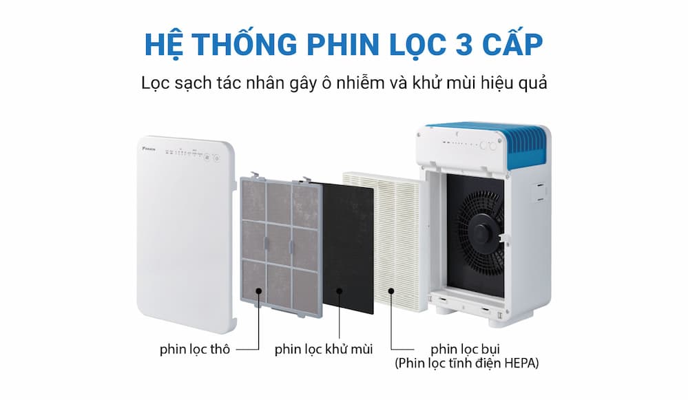 Hệ thống phin lọc 3 cấp máy lọc không khí Daikin MC30VVM-A bao gồm: phin lọc thô, màng lọc khử mùi và màng lọc HEPA bụi mịn, giúp hiệu suất khi lọc được đạt mức tối ưu nhất, đảm bảo lọc hiệu quả triệt để, mang tới không gian sống sạch sẽ, và trong lành nhất cho gia đình bạn