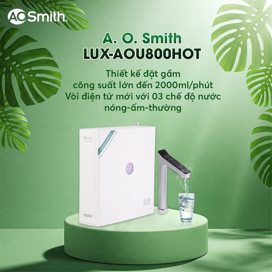Khám phá ngay Máy lọc nước BEST SELLER của A. O. Smith: Đặt gầm siêu nhỏ gọn, 03 chế độ nước nóng – ấm - thường tiện dụng, công nghệ lọc trực tiếp cho nguồn nước tươi mới. Sở hữu kiểu dáng hiện đại cùng tính năng vượt trội, A. O. Smith LUX-AOU800HOT mang đến nguồn nước an toàn và trải nghiệm tiện nghi cho không gian sống hiện đại. Máy lọc nước A. O. Smith ROSS™ LUX-AOU800HOT là dòng máy lọc nước đặt gầm thế hệ mới, nổi bật với công suất lọc cực lớn (800GPD) và khả năng cung cấp nước nóng trực tiếp tại vòi - một tính năng hiếm thấy trên các dòng máy âm tủ. LUX-AOU800HOT là lựa chọn tối ưu cho các gia đình ở chung cư hoặc nhà phố có không gian bếp hiện đại, cần sự tiện lợi của nước nóng ngay tại vòi mà vẫn muốn giữ tính thẩm mỹ gọn gàng.