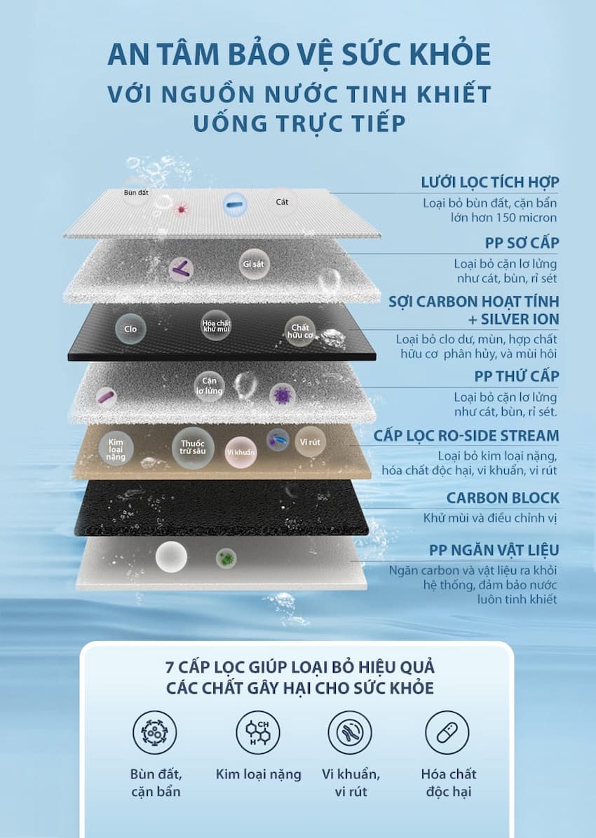 Độ tin cậy cao: Loại bỏ 99.9% kim loại nặng (Asen, Chì, Thủy ngân), vi khuẩn và virus, đảm bảo nước uống trực tiếp đạt chuẩn quốc tế.