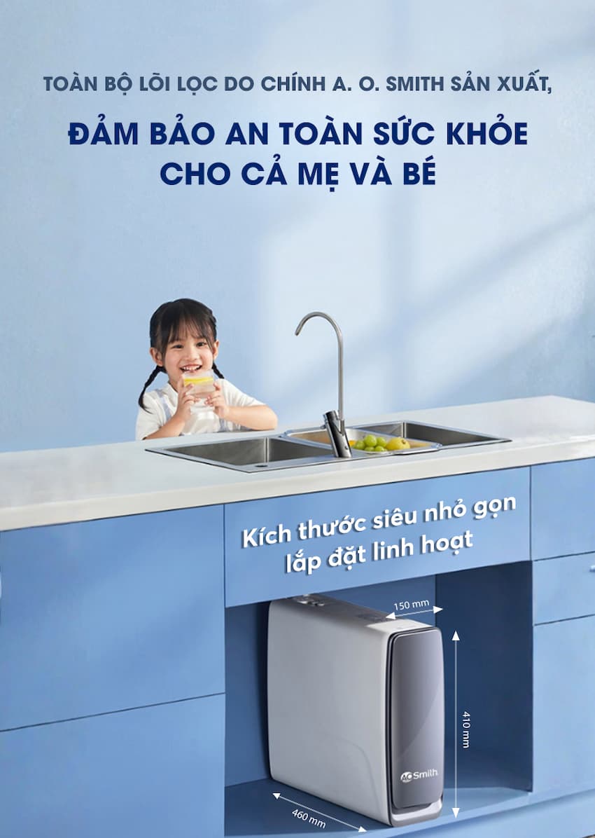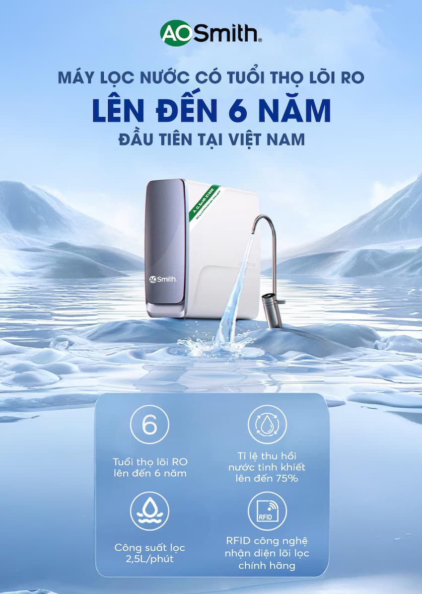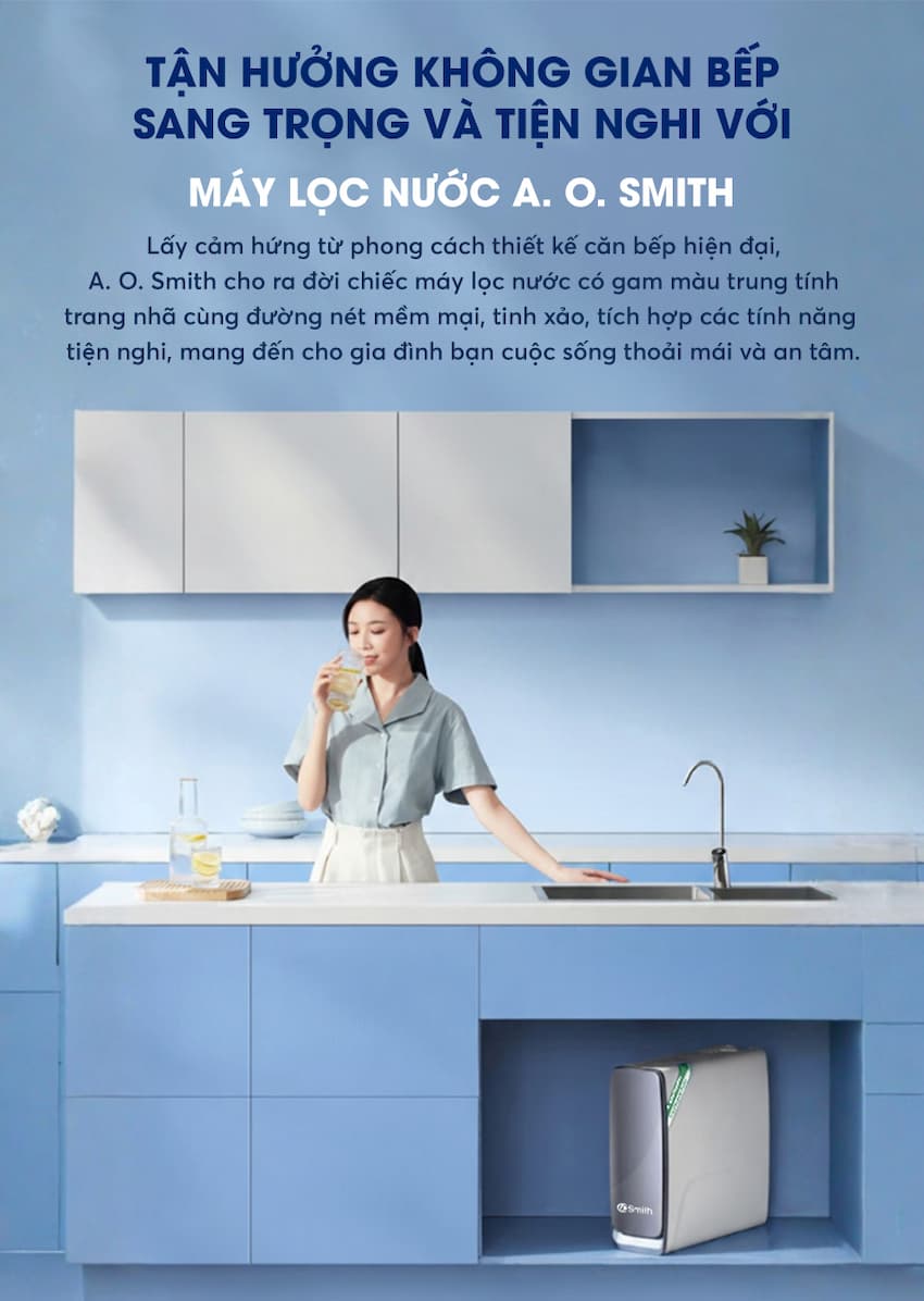 Chào bạn, AO Smith X1000 là dòng máy lọc nước đặt gầm thế hệ mới nhất của thương hiệu Mỹ, nổi bật với kỷ lục về tuổi thọ lõi lọc và công suất lọc tại thị trường Việt Nam. A. O. Smith X1000 không chỉ là máy lọc nước uống, nó là một "trạm sản xuất nước tinh khiết" công suất lớn, cực kỳ nhỏ gọn (chỉ dày 15cm) và có chi phí thay lõi chia theo năm rẻ nhất trong phân khúc cao cấp. Đây là bản nâng cấp mới nhất giúp kéo dài tuổi thọ màng lọc lên tới 6 năm. Công nghệ này không chỉ loại bỏ 99.9% kim loại nặng, vi khuẩn, virus mà còn tăng tỷ lệ thu hồi nước tinh khiết lên mức cao nhất hiện nay (75%), giúp tiết kiệm nước đáng kể so với các máy RO thông thường. Máy lọc nước AO Smith X1000 là giải pháp lọc nước cao cấp được thiết kế đặc biệt để lắp đặt dưới gầm tủ bếp (undercounter), giúp tối ưu không gian và cung cấp nước tinh khiết trực tiếp tại vòi.