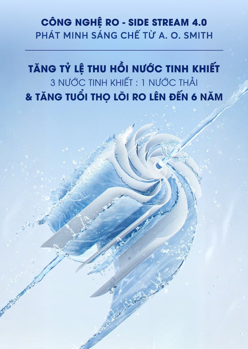 Đây là điểm khác biệt lớn nhất. Trong khi các máy RO thông thường yêu cầu thay màng lọc sau 12-24 tháng, và các dòng AO Smith đời trước là 3 năm, thì máy lọc nước AO Smith X1000 sở hữu màng lọc RO – Side Stream 4.0 với tuổi thọ lên tới 72 tháng (6 năm).