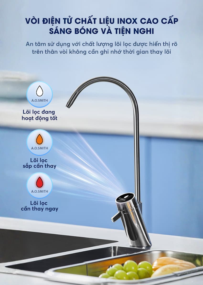 Cảnh báo thông minh: Vòi điện tử hiển thị tình trạng lõi lọc ngay trên vòi lấy nước.