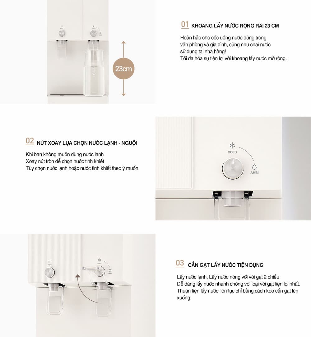 Đa năng tiện lợi: Máy cung cấp đồng thời nước nóng, lạnh và nước thường, đáp ứng mọi nhu cầu sử dụng như uống trực tiếp, pha trà, cà phê, nấu ăn, v.v. Khoang lấy nước cao 23cm phù hợp với nhiều loại cốc, bình.