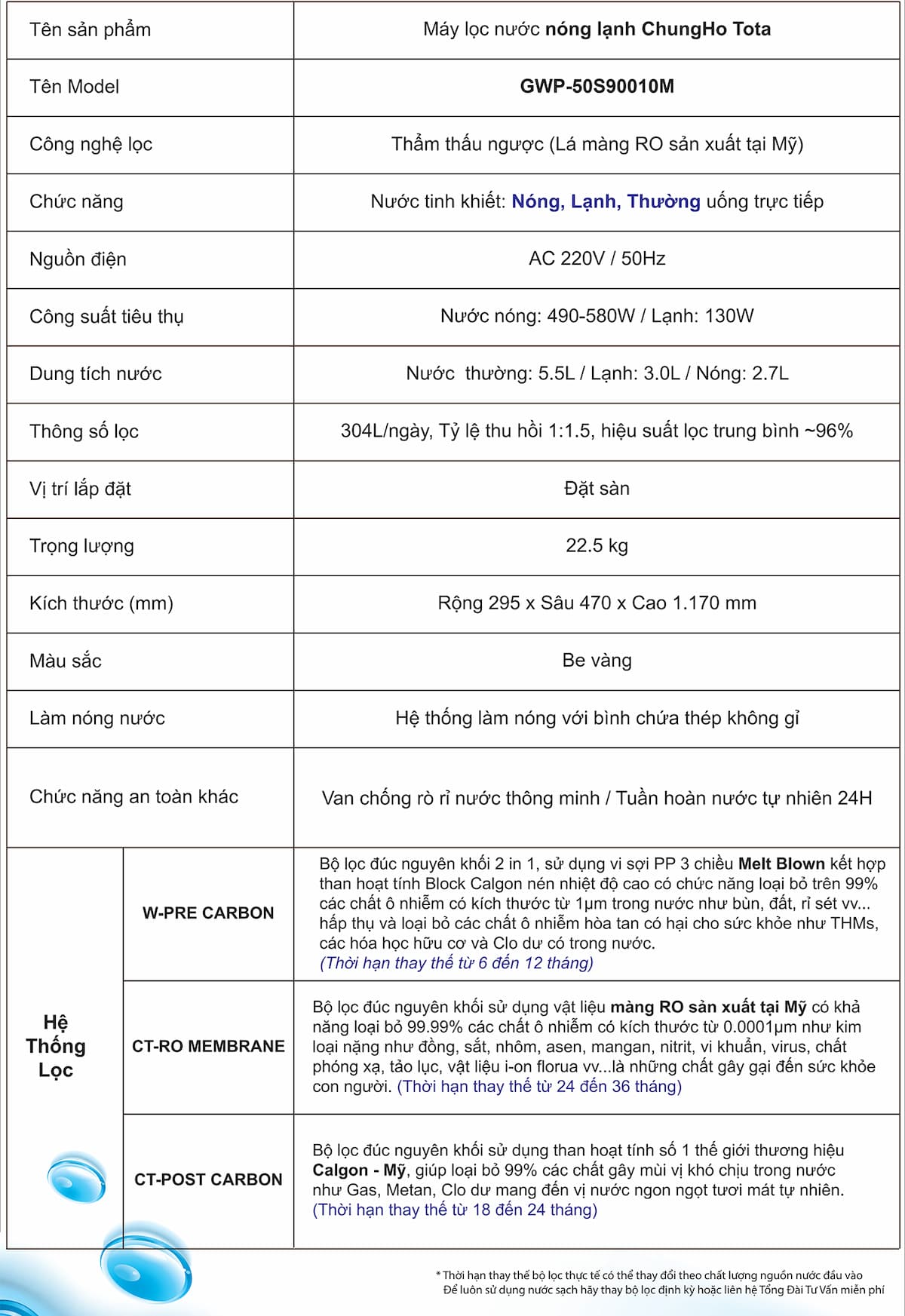 Thông số kỹ thuật Máy lọc nước Chungho TOTA (GWP-50S90010M)