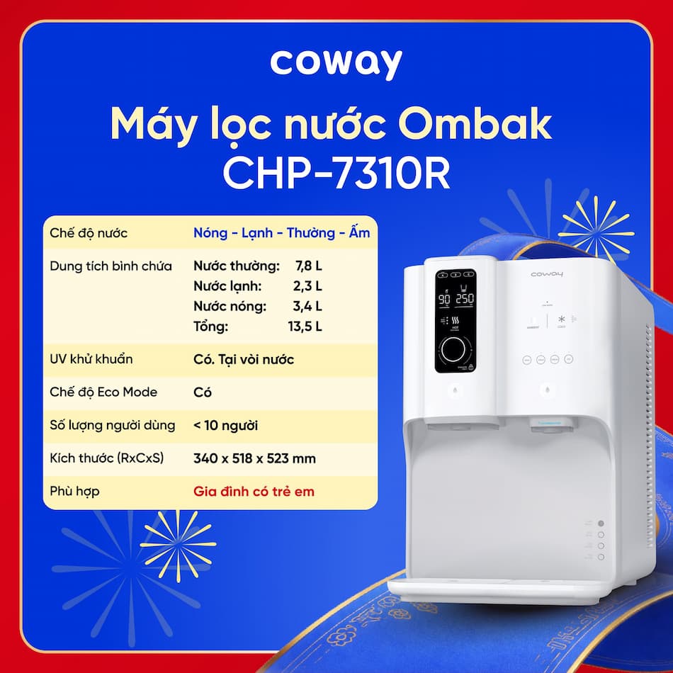 Máy lọc nước Coway Ombak (Model: CHP-7310R) được mệnh danh là "ông vua" của dòng máy lọc nước để bàn nhờ khả năng tùy biến nhiệt độ cực kỳ linh hoạt và dung tích bình chứa lớn. Với công nghệ diệt khuẩn bằng tia UV hiện đại, Ombak loại bỏ tạp chất độc hại và giữ lại những khoáng chất tốt cho sức khỏe, mẹ hoàn toàn yên tâm khi gia đình sử dụng những giọt nước tinh khiết và mát lành nhất. Chiếc Ombak CHP-7310R không chỉ là một chiếc máy lọc nước thông thường mà được coi là "trạm nước" đa năng nhất của Coway. Nếu gia đình bạn có trẻ nhỏ cần pha sữa thường xuyên hoặc người lớn tuổi thích uống trà, Coway Ombak là sự lựa chọn tối ưu nhất nhờ sự linh hoạt về nhiệt độ mà hiếm dòng máy nào trên thị trường có được.
