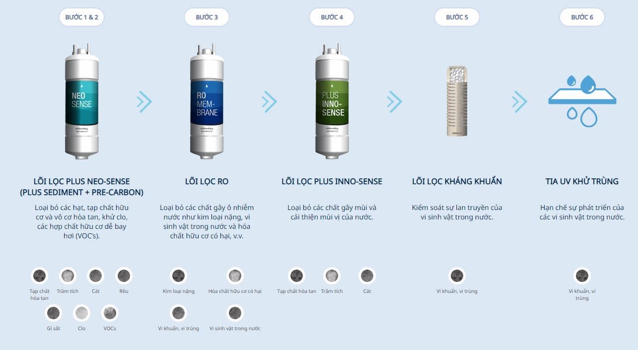 Sử dụng màng lọc RO cao cấp giúp loại bỏ đến 99.99% tạp chất, kim loại nặng, vi khuẩn và virus. Hệ thống 5 bước lọc không chỉ làm sạch mà còn khử mùi và tạo vị ngọt tự nhiên cho nước (thông qua lõi Plus Inno-sense).