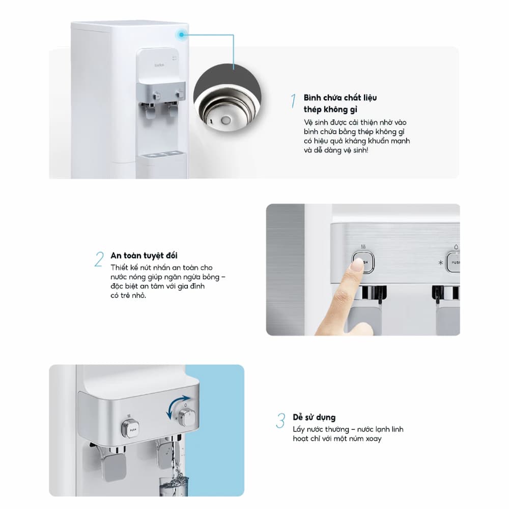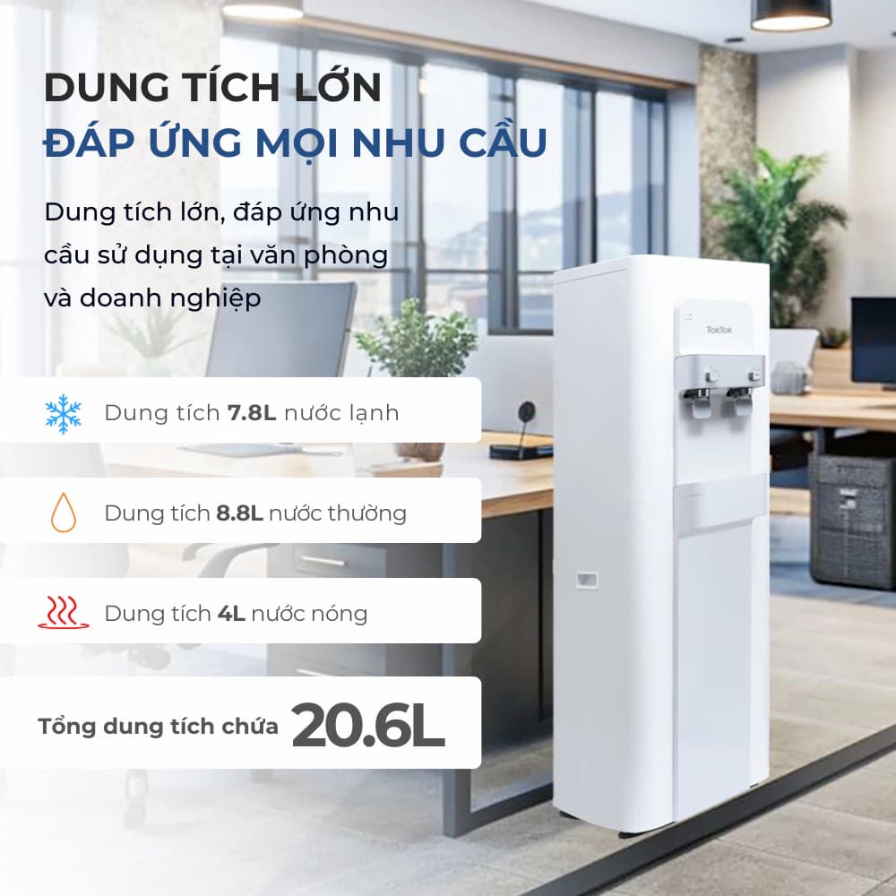 Khả năng phục vụ liên tục: Với tổng dung tích 20.6 lít (bao gồm 8.8L nước thường, 7.8L nước lạnh và 4.0L nước nóng), máy đảm bảo không bị thiếu nước ngay cả trong giờ cao điểm tại văn phòng hoặc các buổi tiệc gia đình.