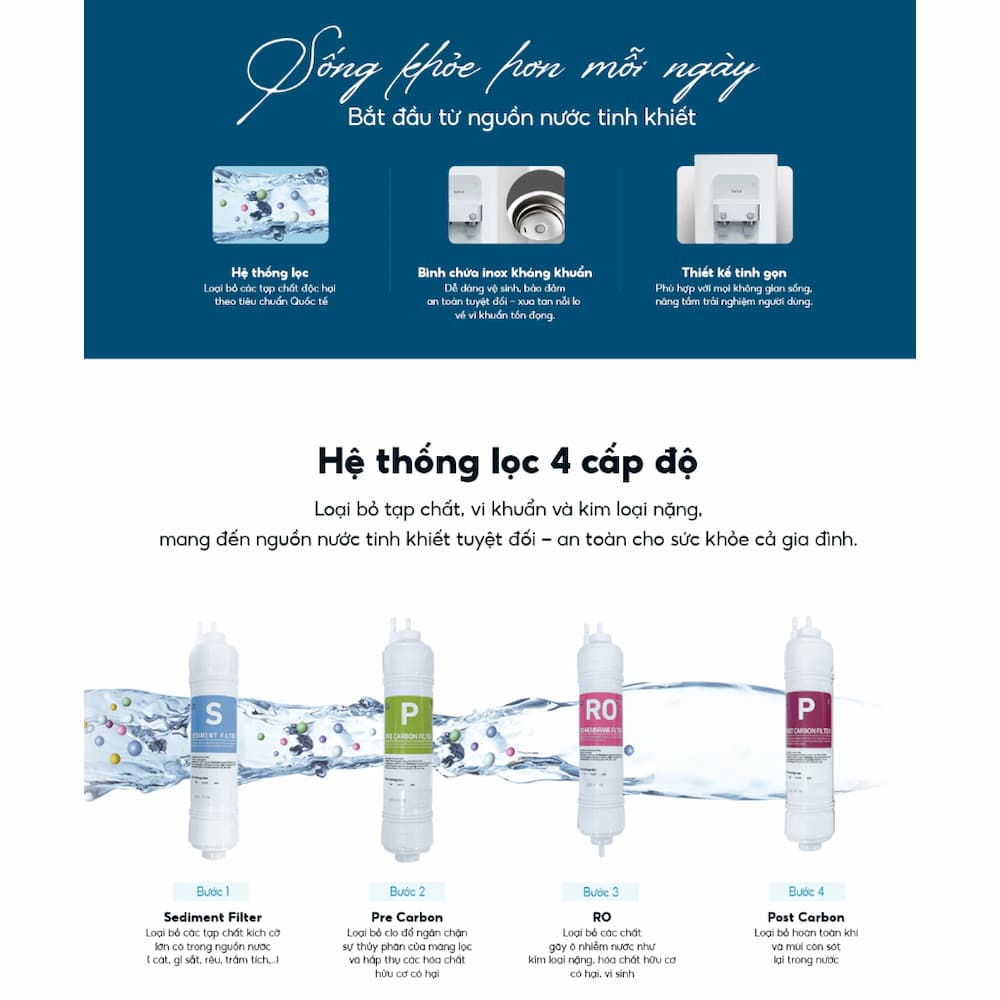 Chuẩn sạch quốc tế: Hệ thống 4 lõi lọc được sản xuất theo tiêu chuẩn khắt khe của Hàn Quốc, đảm bảo nước đầu ra đạt độ tinh khiết cao, có thể uống trực tiếp tại vòi mà không cần đun sôi.