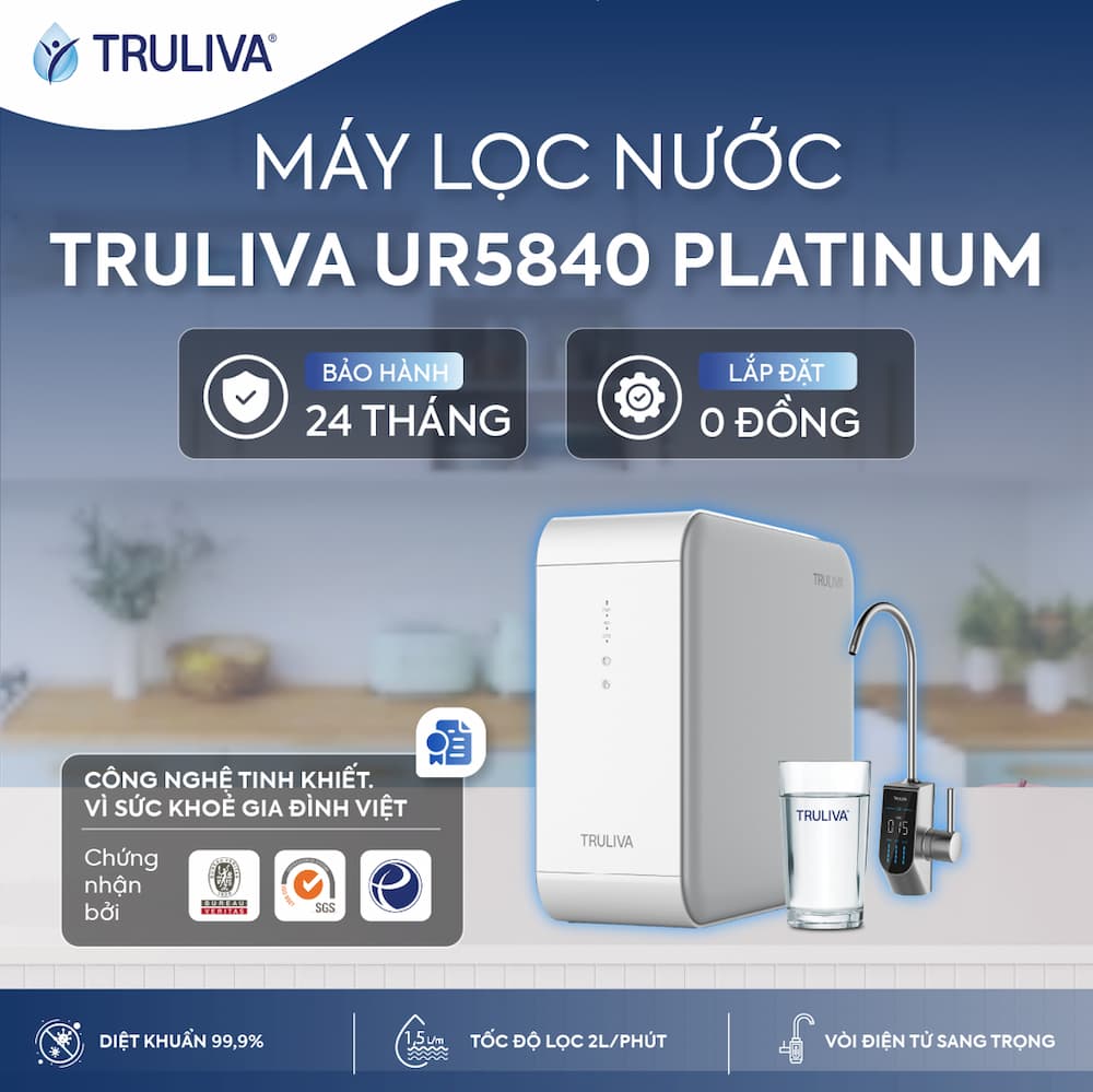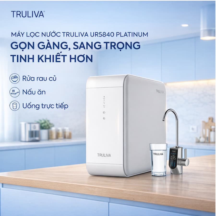 Máy lọc nước Truliva UR5840 là giải pháp lọc nước hiệu suất cao, thiết kế siêu mỏng để tối ưu diện tích gầm tủ bếp. Truliva Delica UR5840 Platinum là máy lọc nước âm tủ bếp uống trực tiếp tại vòi, áp dụng công nghệ lọc TRU-TECH PLUS™, cùng màng lọc thẩm thấu ngược RO với 5 bước lọc tích hợp trong 3 lõi lọc loại bỏ 99% vi khuẩn, vi rút, kim loại nặng và các chất gây ô nhiễm. Hệ thống vòi thông minh tích hợp UV và màn hình hiển thị TDS chính là điểm "đắt giá" nhất giúp mẫu máy này vượt trội hơn các đối thủ cùng phân khúc âm tủ bếp. Tất cả hội tụ ở Truliva UR5840 mang đến nguồn nước tinh khiết tận tay, giúp bạn an tâm sử dụng, tận hưởng trọn vẹn từng phút giây cuộc sống.