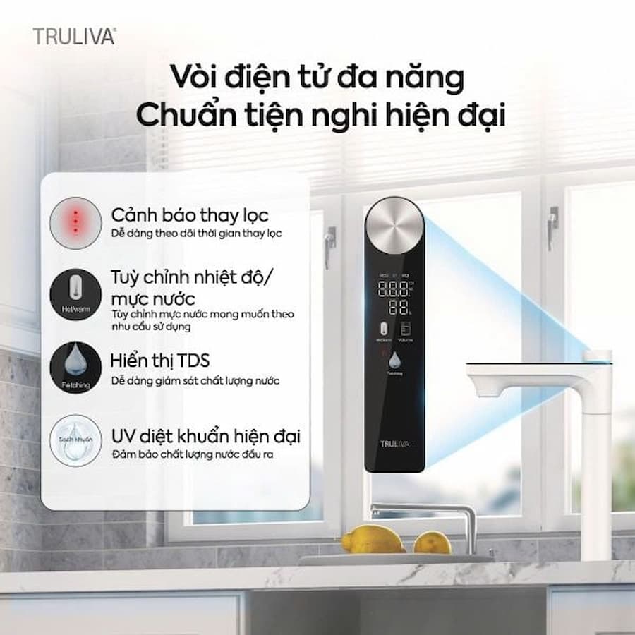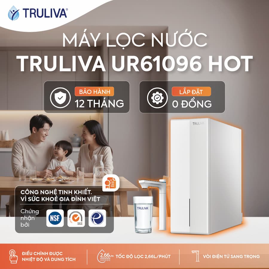 Truliva UR61096H là giải pháp lọc nước hiện đại cho căn bếp, kết hợp giữa công nghệ lọc RO tinh khiết và hệ thống làm nóng thông minh. Đây là dòng máy lọc nước RO âm tủ bếp cao cấp, nổi bật với khả năng cung cấp nước nóng tức thì và thiết kế siêu mỏng không bình chứa. Với Truliva, công nghệ không chỉ để “ấn tượng”, mà để phục vụ những điều quan trọng nhất: sức khỏe gia đình – sự an tâm – và chất lượng sống bền vững mỗi ngày. Đã đến lúc nâng cấp không gian sống với Máy lọc nước Nóng âm tủ bếp UR61096H – Tuyệt tác máy lọc nước thông minh, nhỏ gọn cho năm 2026: Thiết kế âm tủ gọn gàng: Siêu tiết kiệm diện tích vừa vặn mọi không gian. Màu sắc thời thượng: Tone màu trắng sang trọng, sáng bừng chuẩn gu nội thất hiện đại. Màn hình điện tử siêu nét: Máy lọc nước Truliva UR61096H hiển thị độ tinh khiết (TDS), dung tích, UV và thông tin lõi lọc ngay trên vòi. Công nghệ Hot Crystal Heating 3.0 siêu nhanh, đa dạng mức độ nhiệt từ 25 - 98 độ C phục vụ đa dạng nhu cầu sử dụng (uống nước, rửa rau, nấu ăn, pha trà, pha sữa,...). 👉 Đừng để một chi tiết nhỏ làm hỏng không gian nghệ thuật của bạn.