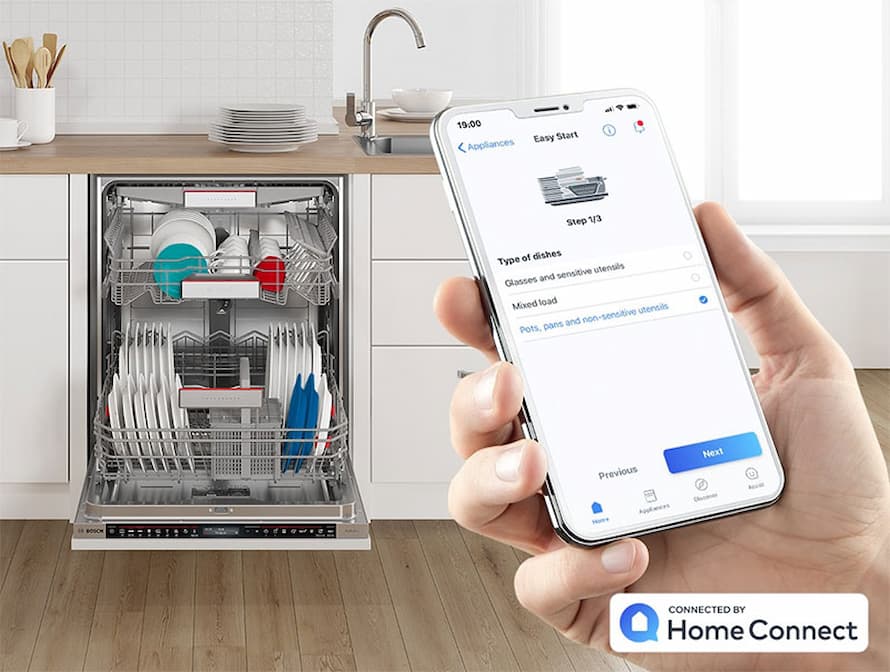 Hiện đại trong thiết kế, thế nhưng SMV6ZCX42E cũng cực kỳ thông minh. Người dùng có thể kết nối trực tiếp máy để điều khiển, theo dõi từ xa với ứng dụng Home Connect không cần biết bạn đang ở đâu. Đặc biệt, nếu quá lười để lựa chọn một chương trình thích hợp cho việc rửa sạch bát đĩa, chỉ cần nhập độ bẩn, số lượng để Easy Start đưa ra phương án tối ưu cho bạn.