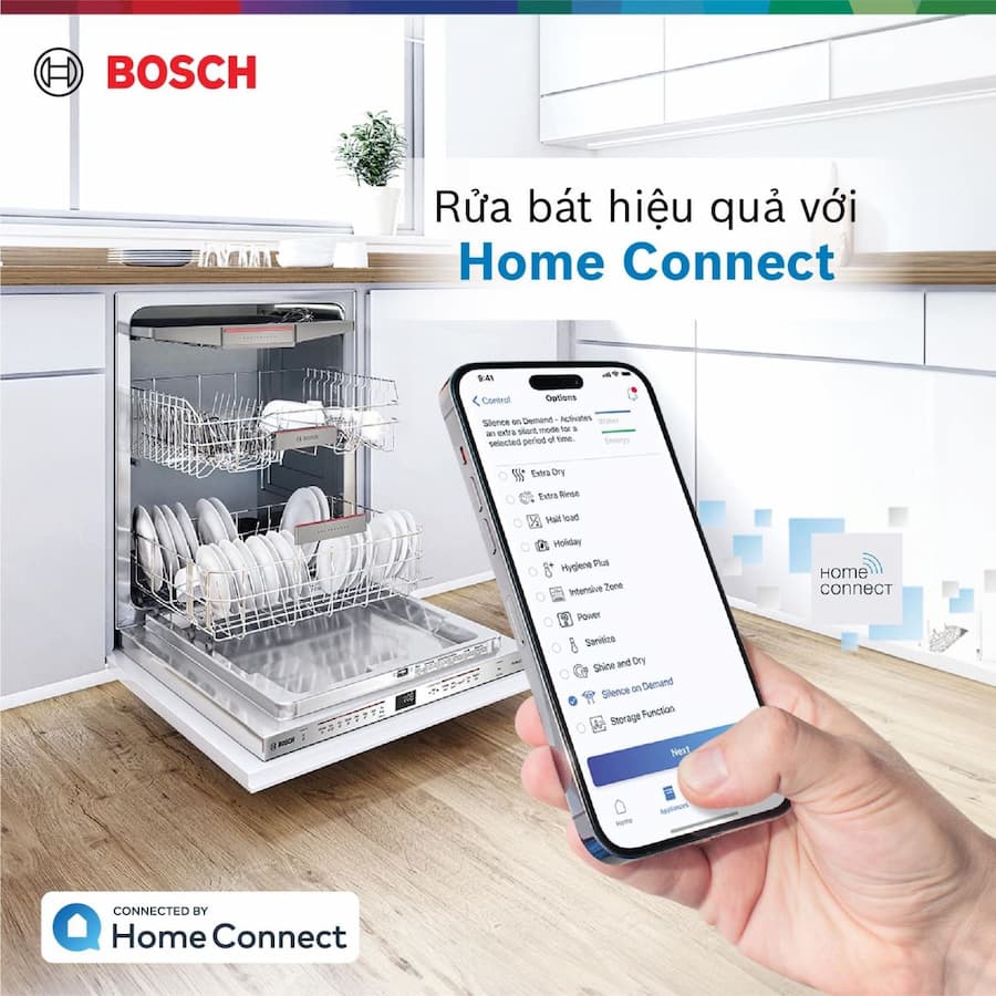 Home Connect: Kết nối máy rửa bát với điện thoại thông minh qua ứng dụng, cho phép điều khiển từ xa, nhận thông báo, và truy cập các tính năng thông minh khác.