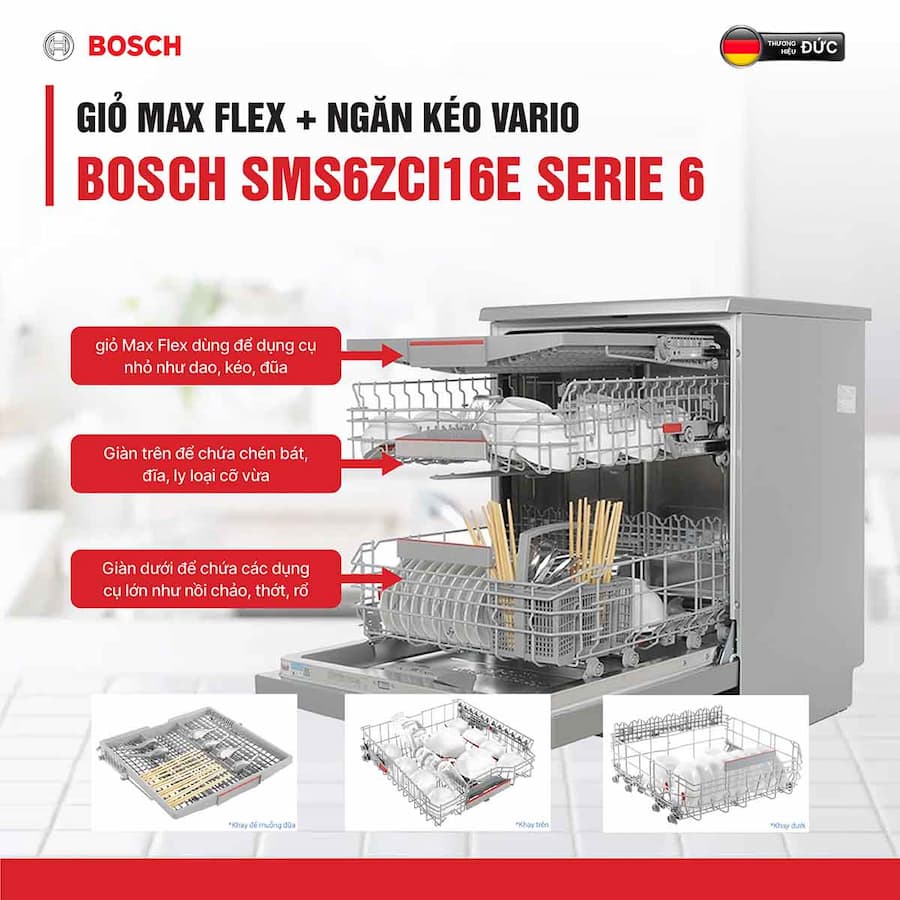 Khóa trẻ em: (Ngụ ý, thường là tiêu chuẩn trên máy rửa bát Bosch, và các cảnh báo an toàn chung đề cập đến việc giữ trẻ em tránh xa máy đang mở và chất tẩy rửa ). Mặc dù không được đề cập rõ ràng là một tên tính năng cho SMS6ZCI16E, nhưng các hướng dẫn an toàn chung của Bosch nhấn mạnh sự an toàn của trẻ em.