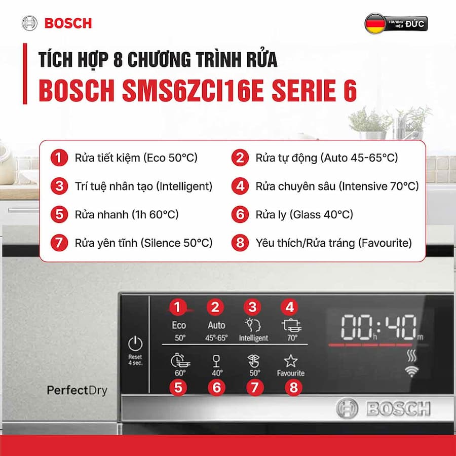 SMS6ZCI16E cung cấp một bộ toàn diện gồm "8 chương trình" , mang lại sự linh hoạt cho nhiều nhu cầu rửa bát khác nhau. Các chương trình này bao gồm: